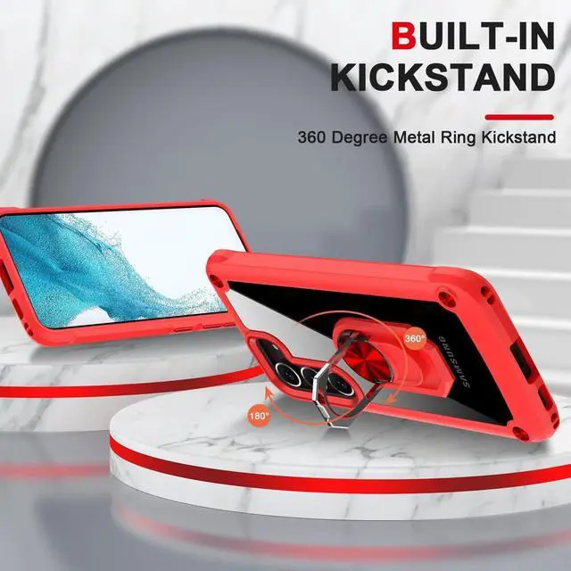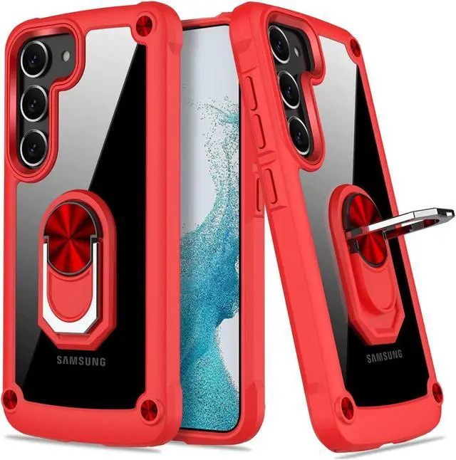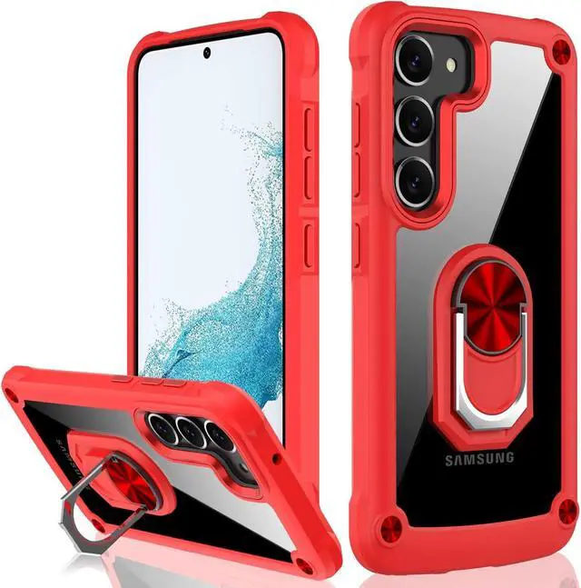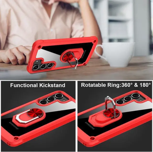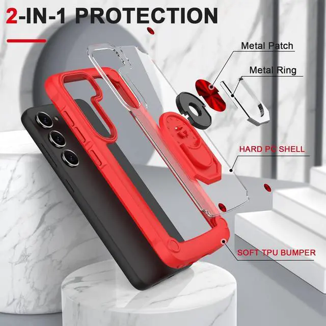 Features: Compatible with Samsung Galaxy S23 Plus 5G. Extensively drop tested, so you can feel reassured that your device is well protected. Crystal clear case provides a slim fitting stylish design and reinforced corner shock protection against damage, keeping your device looking great at all time. Made from reinforced bonded thermopolyurethane and optical grade polycarbonate materials, which makes it flexible enough to absorb punishment but hard enough to resist potential damage. The back of the case has a built-in extremely practical handle, Ring, which can be put on the finger to hold the phone more securely in your hand. Pull the ring out and have a handy viewing stand to comfortably watch your favorite show. Designed to be slim, lightweight and strong - so you can be assured that this case will add virtually no extra bulk to your phone and will still fit in your pocket with ease. Raised bezels on the case protects your phone's screen and camera from scratches. independent metal buttons for an easy, conspicuous press. Enjoy magnetic mount compatibility, as the ring holder also functions as a built-in metal plate.