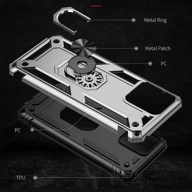 Layer 2: One-piece custom molded polycarbonate shell. Featuring a robust multi-layered design, the case provides extreme protection for your smartphone. This hard-wearing tough case safe-guards your phone against whatever life can throw your way, keeping your device secure at all times even in the most extreme of conditions. Raised front bezel and camera opening prevent scratches to the screen and camera lens. With fluid press buttons included in the design of this case, you can be sure to have a case that will protect your new device perfectly, without interrupting it's every day use. Enjoy magnetic mount compatibility, as the ring holder also functions as a built-in metal plate. Precise cutouts provide full access to your phone’ s important features, ports and button.