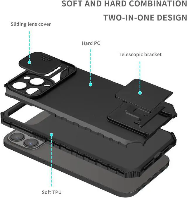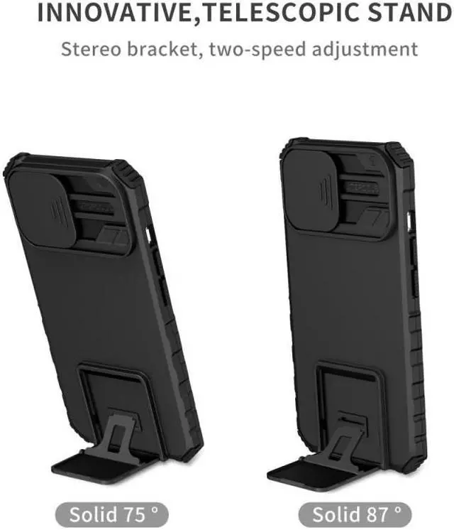 Features: Compatible with Apple iPhone 14 Pro Max. Extensively drop tested, so you can feel reassured that your device is well protected. Two layered case protects from bumps, scrapes and drops. Made from robust and hard-wearing materials for long-lasting protection. Privacy cover slides in front of camera when not in use. Your phone's camera can be hacked - get protected. Portable flip-out stand that pulls out to give the perfect viewing angle for videos and pictures. Non-slip coating with reinforced corners provide excellent protection where it's most needed. Etched grips at the sides aids handling. Raised bezels lift screen and camera off flat surfaces. Intuitive button covers for a tactile experience. Cut-outs for the main ports and features of the phone.