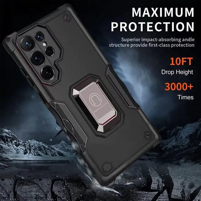 to withstands 4X MIL-STD (810G- 516.6 ), meaning the cases have been dropped at 2 meters with zero damage done to the device. Featuring a robust multi-layered design, the case provides extreme protection for your device. This hard-wearing tough case safe-guards your phone against whatever life can throw at, keeping it secure at all times even in the most extreme of conditions. A soft rubberized TPU inner core tightly grips to your phone while absorbs shock and cushions the phone from drops and impact. Patented hybrid case with ridge polycarbonate hard shell for armor-like protection. Reinforced air cushion corners provide excellent protection where it's most needed. The back of the case has a built-in extremely practical handle, Ring, which can be put on the finger to hold the phone more securely in your hand. It also allows you to attach the phone to a magnetic car holder. Pull the ring out and have a handy viewing stand to comfortably watch your favorite show. Raised front bezel and camera opening prevent scratches to the screen and camera lens. Integrated camera lens bumper protector protects the lens from accidental drops.