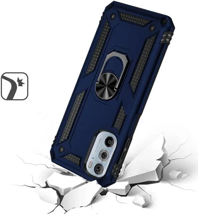 Features: Compatible with Motorola Edge 2022. Military Standard Shock Test MIL-STD 810G- 516.6 Protection. The case endured 26 drops (at 48in) on all 6 faces, 12 edges and 8 corners of the device and sustained zero damage to the appearance and internal hardware of the phone itself. Made from a special strong and lightweight durable material, providing you with long lasting protection for your smartphone without making it cumbersome. The Ring Armor gets its name from an ingenious finger loop system on the rear of the case. This loop folds flat and out of view if you do not want or need it. But if you do, simply pull the loop out, slip your finger through and you have an extra secure grip on your phone. Another benefit of the ring holder is that the loop can also perform as a handy viewing stand. Just pull the loop out to its full extent and rest your phone at an angle on a flat surface. Unique mix material hybrid design.