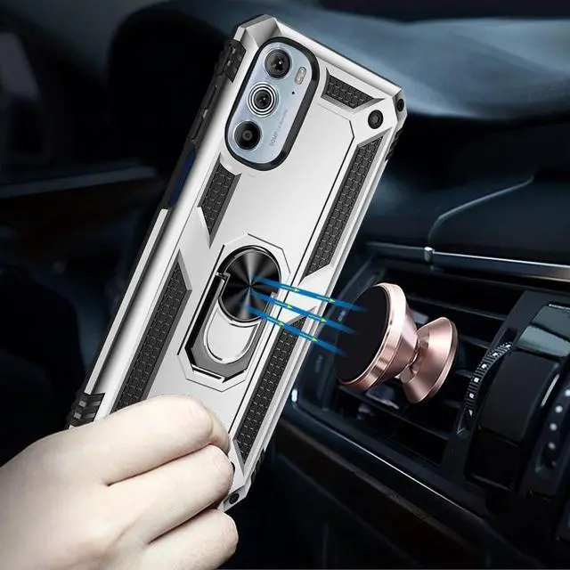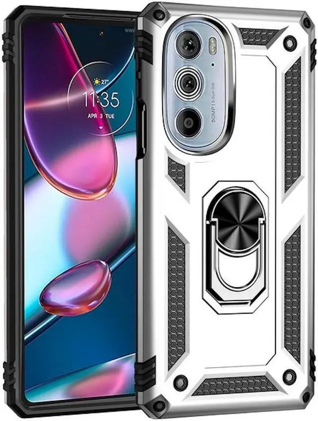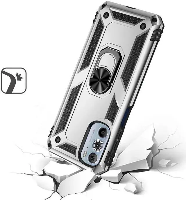 Features: Compatible with Motorola Edge 2022. Military Standard Shock Test MIL-STD 810G- 516.6 Protection. The case endured 26 drops (at 48in) on all 6 faces, 12 edges and 8 corners of the device and sustained zero damage to the appearance and internal hardware of the phone itself. Made from a special strong and lightweight durable material, providing you with long lasting protection for your smartphone without making it cumbersome. The Ring Armor gets its name from an ingenious finger loop system on the rear of the case. This loop folds flat and out of view if you do not want or need it. But if you do, simply pull the loop out, slip your finger through and you have an extra secure grip on your phone. Another benefit of the ring holder is that the loop can also perform as a handy viewing stand. Just pull the loop out to its full extent and rest your phone at an angle on a flat surface. Unique mix material hybrid design.