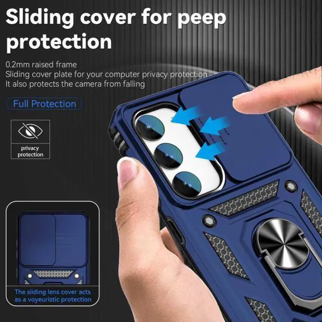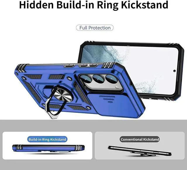 Features: Compatible with Samsung Galaxy S23 Plus 5G. Military Standard Shock Test MIL-STD 810G- 516.6 Protection. The case endured 26 drops (at 48in) on all 6 faces, 12 edges and 8 corners of the device and sustained zero damage to the appearance and internal hardware of the phone itself. Made from a special strong and lightweight durable material, providing you with long lasting protection for your smartphone without making it cumbersome. Ring holder for extra drop protection - in more ways than one. The built-it ring features a 180 & 360 degree rotating design to ensure a comfortable grip at any angle. Flip the ring out and it doubles as a kickstand to take your binge-watching experience to the next level. Privacy cover slides in front of camera when not in use. Unique mix material hybrid design.