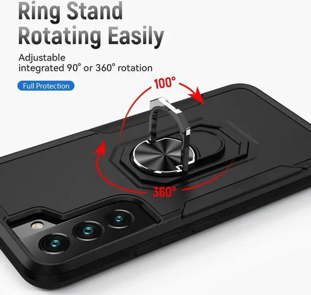 Features: Compatible with Samsung Galaxy S23 5G. Military Standard Shock Test MIL-STD 810G- 516.6 Protection. The case endured 26 drops (at 48in) on all 6 faces, 12 edges and 8 corners of the device and sustained zero damage to the appearance and internal hardware of the phone itself. Featuring a robust multi-layered design, the Tuff Case provides extreme protection for your device. This hard-wearing tough case safe-guards your phone against whatever life can throw at, keeping it secure at all times even in the most extreme of conditions. A soft rubberized TPU inner core tightly grips to your phone while absorbs shock and cushions the phone from drops and impact. Patented hybrid case with ridge polycarbonate hard shell for armor-like protection. The back of the case has a built-in extremely practical handle, Ring, which can be put on the finger to hold the phone more securely in your hand. Pull the ring out and have a handy viewing stand to comfortably watch your favorite show. Raised front bezel and camera opening prevent scratches to the screen and camera lens. Textured rubbery interior for impact resistant protection.