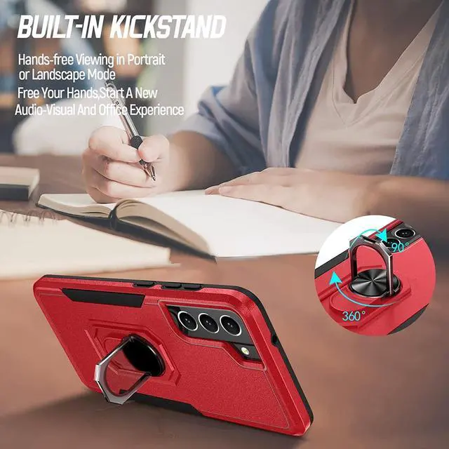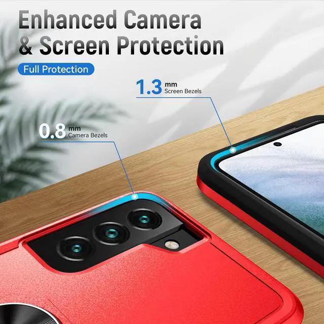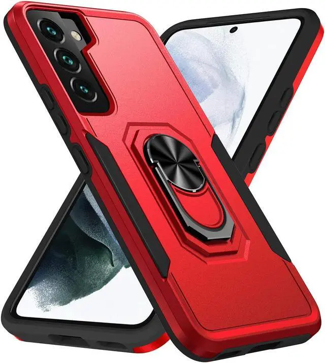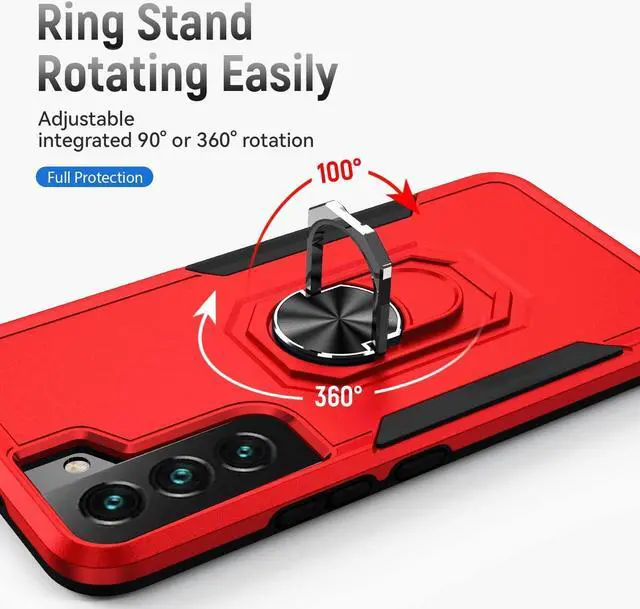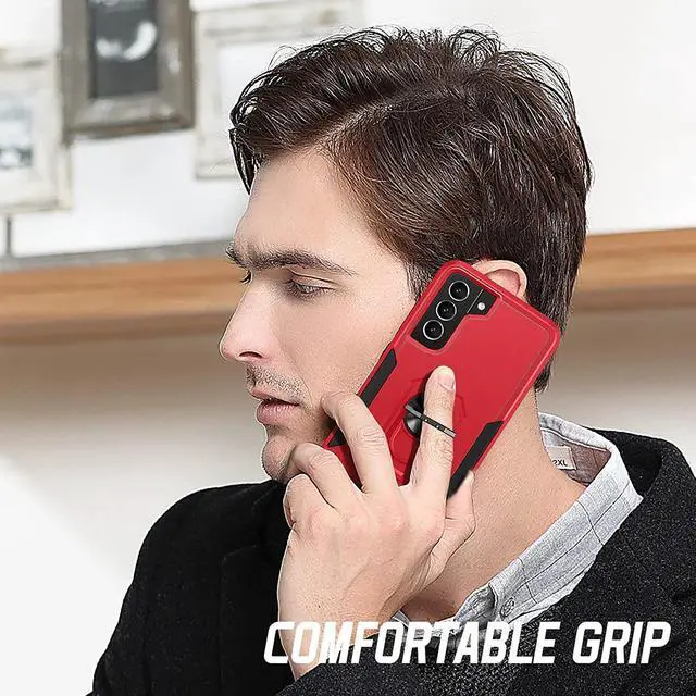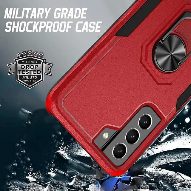 Features: Compatible with Samsung Galaxy S23 5G. Military Standard Shock Test MIL-STD 810G- 516.6 Protection. The case endured 26 drops (at 48in) on all 6 faces, 12 edges and 8 corners of the device and sustained zero damage to the appearance and internal hardware of the phone itself. Featuring a robust multi-layered design, the Tuff Case provides extreme protection for your device. This hard-wearing tough case safe-guards your phone against whatever life can throw at, keeping it secure at all times even in the most extreme of conditions. A soft rubberized TPU inner core tightly grips to your phone while absorbs shock and cushions the phone from drops and impact. Patented hybrid case with ridge polycarbonate hard shell for armor-like protection. The back of the case has a built-in extremely practical handle, Ring, which can be put on the finger to hold the phone more securely in your hand. Pull the ring out and have a handy viewing stand to comfortably watch your favorite show. Raised front bezel and camera opening prevent scratches to the screen and camera lens. Textured rubbery interior for impact resistant protection.