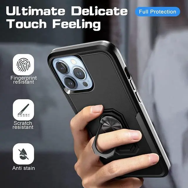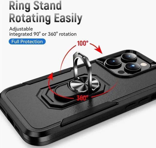 Features: Compatible with Apple iPhone 14 Pro. Military Standard Shock Test MIL-STD 810G- 516.6 Protection. The case endured 26 drops (at 48in) on all 6 faces, 12 edges and 8 corners of the device and sustained zero damage to the appearance and internal hardware of the phone itself. Featuring a robust multi-layered design, the Tuff Case provides extreme protection for your device. This hard-wearing tough case safe-guards your phone against whatever life can throw at, keeping it secure at all times even in the most extreme of conditions. A soft rubberized TPU inner core tightly grips to your phone while absorbs shock and cushions the phone from drops and impact. Patented hybrid case with ridge polycarbonate hard shell for armor-like protection. The back of the case has a built-in extremely practical handle, Ring, which can be put on the finger to hold the phone more securely in your hand. Pull the ring out and have a handy viewing stand to comfortably watch your favorite show. Raised front bezel and camera opening prevent scratches to the screen and camera lens. Textured rubbery interior for impact resistant protection.