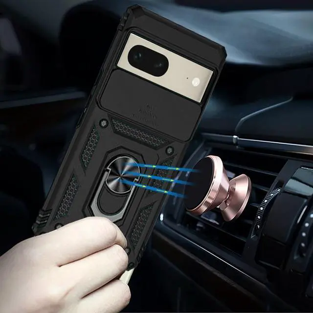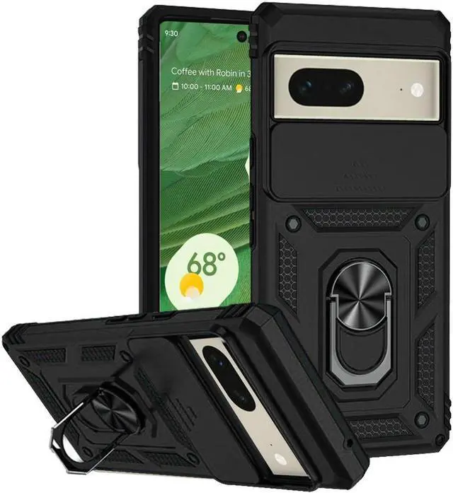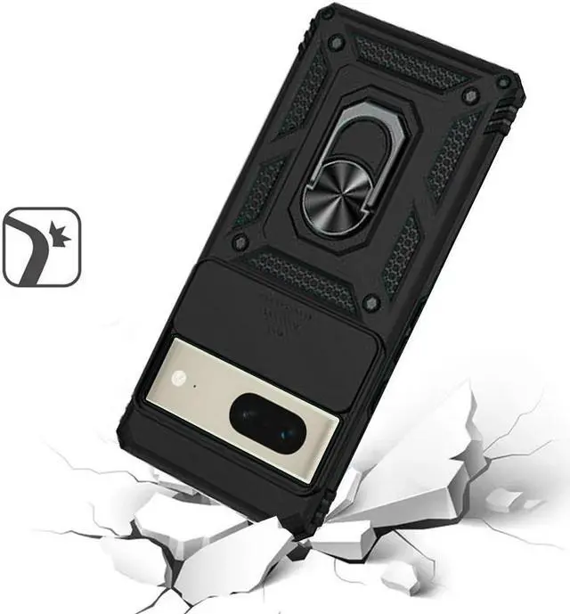 Features: Compatible with Google Pixel 7. Military Standard Shock Test MIL-STD 810G- 516.6 Protection. The case endured 26 drops (at 48in) on all 6 faces, 12 edges and 8 corners of the device and sustained zero damage to the appearance and internal hardware of the phone itself. Made from a special strong and lightweight durable material, providing you with long lasting protection for your smartphone without making it cumbersome. Ring holder for extra drop protection - in more ways than one. The built-it ring features a 180 & 360 degree rotating design to ensure a comfortable grip at any angle. Flip the ring out and it doubles as a kickstand to take your binge-watching experience to the next level. Privacy cover slides in front of camera when not in use. Unique mix material hybrid design.