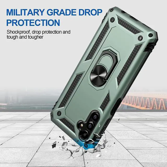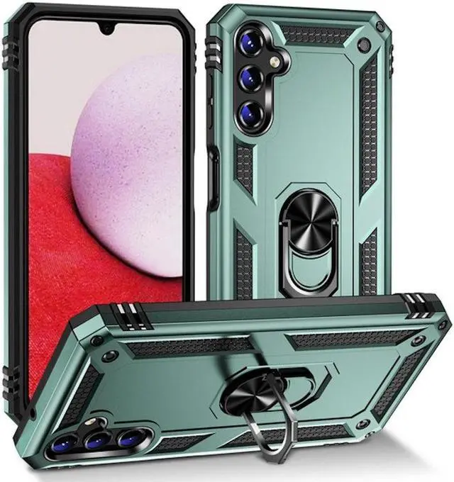 Features: Compatible with Samsung Galaxy A14 5G. Military Standard Shock Test MIL-STD 810G- 516.6 Protection. The case endured 26 drops (at 48in) on all 6 faces, 12 edges and 8 corners of the device and sustained zero damage to the appearance and internal hardware of the phone itself. Made from a special strong and lightweight durable material, providing you with long lasting protection for your smartphone without making it cumbersome. Ring holder for extra drop protection - in more ways than one. The built-it ring features a 180 & 360 degree rotating design to ensure a comfortable grip at any angle. Flip the ring out and it doubles as a kickstand to take your binge-watching experience to the next level. Unique mix material hybrid design.