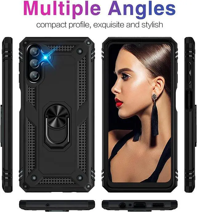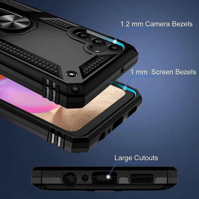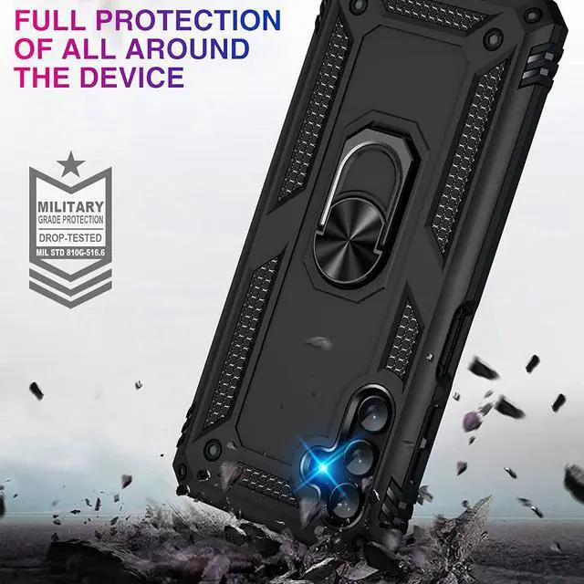 Features: Compatible with Samsung Galaxy A14 5G. Military Standard Shock Test MIL-STD 810G- 516.6 Protection. The case endured 26 drops (at 48in) on all 6 faces, 12 edges and 8 corners of the device and sustained zero damage to the appearance and internal hardware of the phone itself. Made from a special strong and lightweight durable material, providing you with long lasting protection for your smartphone without making it cumbersome. Ring holder for extra drop protection - in more ways than one. The built-it ring features a 180 & 360 degree rotating design to ensure a comfortable grip at any angle. Flip the ring out and it doubles as a kickstand to take your binge-watching experience to the next level. Unique mix material hybrid design.