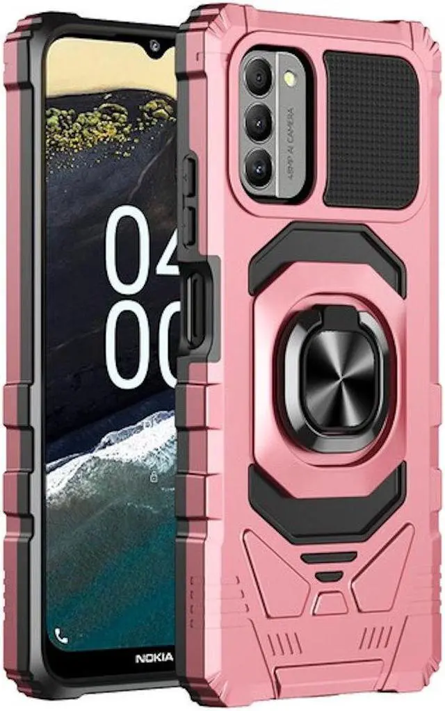 Features: Compatible with Nokia G400 5G. Extensively drop tested, so you can feel reassured that your device is well protected. Made from reinforced bonded thermopolyurethane and high quality polycarbonate materials, which makes it flexible enough to absorb punishment but hard enough to resist potential damage. Ring grip for extra drop protection - in more ways than one. The ring can also perform as a handy viewing stand. Just pull the loop out to its full extent and rest your phone at an angle on a flat surface. The loop will prop the phone up at a perfect viewing angle for watching media. Four corners with beveled exterior offering strong resistance to impact and bumps. Reinforced TPU bumper edges provide excellent protection where it's most needed. The selected materials used have a non-slip coating that provides you with extra grip for your phone, which minimizes the chance of dropping your device. Slim fitting design adds no very little bulk and fits perfectly in your pocket. Raised bezels on the case protects your screen and camera from scratches and dirt. Signature lip designed to protect your device and camera lens from flat falls.
