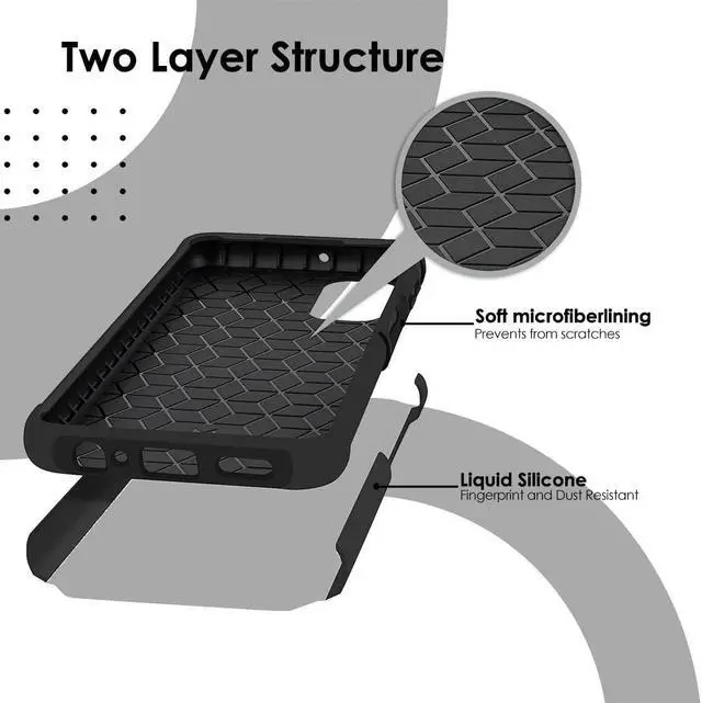 Layer 2: One-piece custom molded polycarbonate shell. 9 ft. drop protection to ensure safety from accident falls. The air cushion corners and bumper edges reduces impact force. Raised-edge bezel protects the screen and camera. Soft-touch finish. Scratch & discoloration resistant. Tactile buttons. Enjoy magnetic mount compatibility, as the ring holder also functions as a built-in metal plate. Precise cutouts provide full access to your phone’ s important features, ports and button.