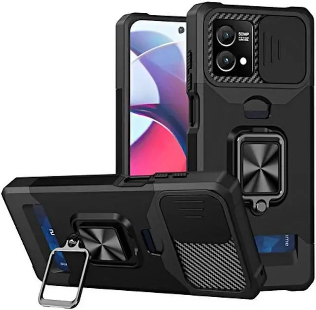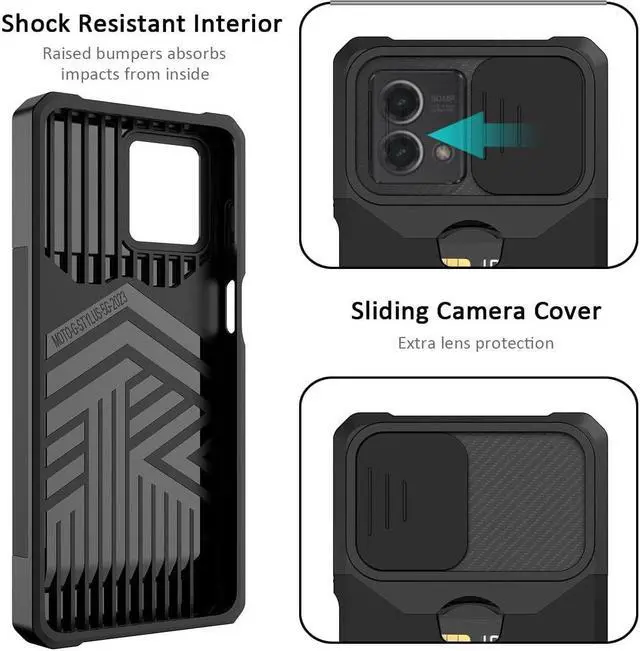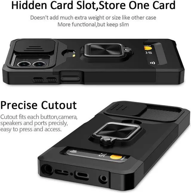 Features: Compatible with Motorola Moto G Stylus 5G 2023. Military Standard Shock Test MIL-STD 810G- 516.6 Protection. The case endured 26 drops (at 48in) on all 6 faces, 12 edges and 8 corners of the device and sustained zero damage to the appearance and internal hardware of the phone itself. Stylish, minimalist protection for your smartphone. Crafted from anti-scratch TPU and a super strong polycarbonate frame, the case protects your device while complimenting its sleek aesthetics. Reinforced corners are designed to deflect shock force away from your phone and the corners are the most vulnerable areas of any phone or case. The back of the case has a built-in extremely practical handle, Ring, which can be put on the finger to hold the phone more securely in your hand. Flip the ring out and it doubles as a kickstand to take your binge-watching experience to the next level. With this case, you can leave your wallet at home thanks to the credit card slot featured on the case. Privacy camera cover slides left or right for total protection. Impact-absorbing TPU perimeter guards the device against bumps and drops.