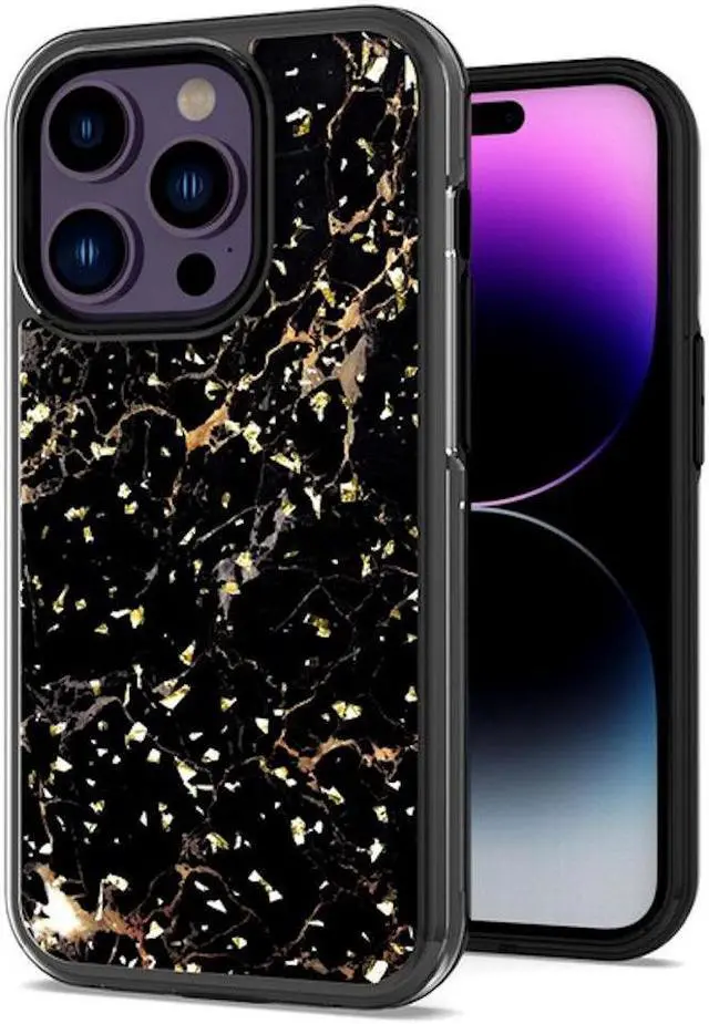 Features: Compatible with Apple iPhone 14 Pro. Extensively drop tested, so you can feel reassured that your device is well protected. With a two piece construction, it provides great shock and impact absorption thanks to its flexible TPU polymer inner bumper which is combined with a precisely positioned hard shell for added protection. Embedded gold flakes design. The case features a tough shell, which covers the back and vulnerable edges of your phone from damage. Slim fitting design adds no extra bulk and fits perfectly in your pocket. The stylish and slim tough outer shell features a scratch-resistant coating so that your case will stay looking fantastic, while offering top of the range protection. Raised beveled edge offers front screen and camera protection. Embossed buttons for an easy, conspicuous press. Features cut-outs for the ports and features including the charging connector and camera.