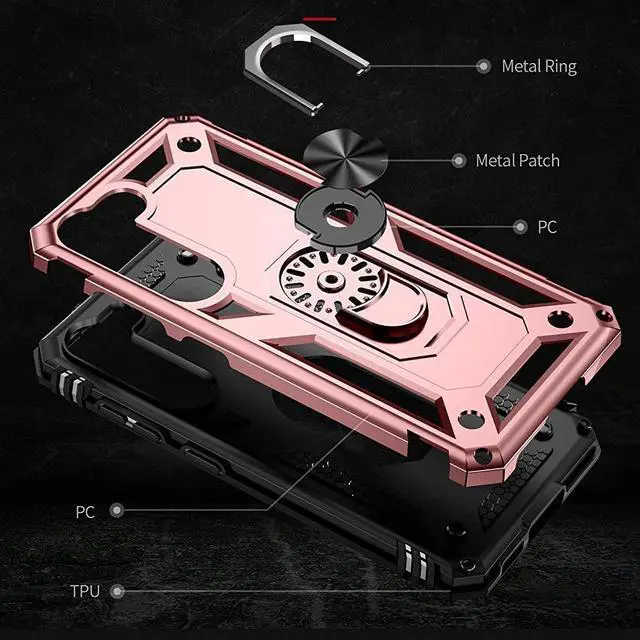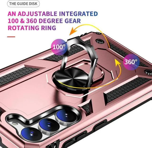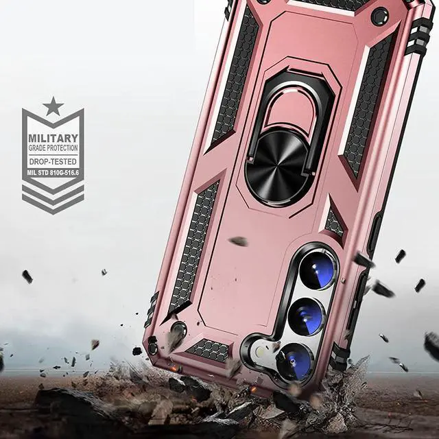 Features: Compatible with Samsung Galaxy S23 Plus 5G. Military Standard Shock Test MIL-STD 810G- 516.6 Protection. The case endured 26 drops (at 48in) on all 6 faces, 12 edges and 8 corners of the device and sustained zero damage to the appearance and internal hardware of the phone itself. Made from a special strong and lightweight durable material, providing you with long lasting protection for your smartphone without making it cumbersome. Ring holder for extra drop protection - in more ways than one. The built-it ring features a 180 & 360 degree rotating design to ensure a comfortable grip at any angle. Flip the ring out and it doubles as a kickstand to take your binge-watching experience to the next level. Unique mix material hybrid design.
