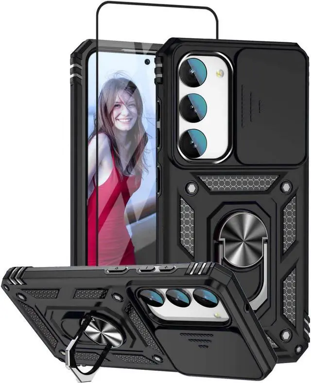 Features: Compatible with Samsung Galaxy S23 Plus 5G. Military Standard Shock Test MIL-STD 810G- 516.6 Protection. The case endured 26 drops (at 48in) on all 6 faces, 12 edges and 8 corners of the device and sustained zero damage to the appearance and internal hardware of the phone itself. Made from a special strong and lightweight durable material, providing you with long lasting protection for your smartphone without making it cumbersome. Ring holder for extra drop protection - in more ways than one. The built-it ring features a 180 & 360 degree rotating design to ensure a comfortable grip at any angle. Flip the ring out and it doubles as a kickstand to take your binge-watching experience to the next level. Privacy cover slides in front of camera when not in use. Unique mix material hybrid design.