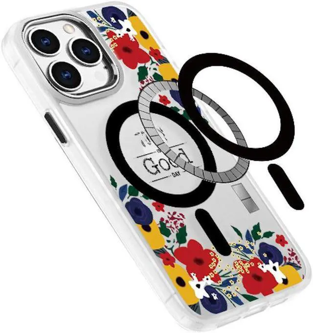 Features: Compatible with Apple iPhone 14 Pro. Designed to interact with Apple’ s MagSafe ecosystem. Built-in magnetic ring for strengthened MagSafe connections. Compatible with Apple MagSafe chargers and accessories so you can power up without removing the case. Inspirational floral illustrations. The minimalist design of this case gives you everything you need, from a slim profile to its incredible drop protection - plus it’ s a total beauty. One-piece platform design with soft rubber and hard polycarbonate. Reinforced corners provide excellent drop protection. Soft rubber bumper for enhanced grip and scratch protection. Transparent hard-shell polycarbonate backing lets the color of your phone shine through. Antimicrobial case protection. Raised camera cut-out protects the lens from scratches when placing your phone on flat surface. Access to all features, functions and connections.