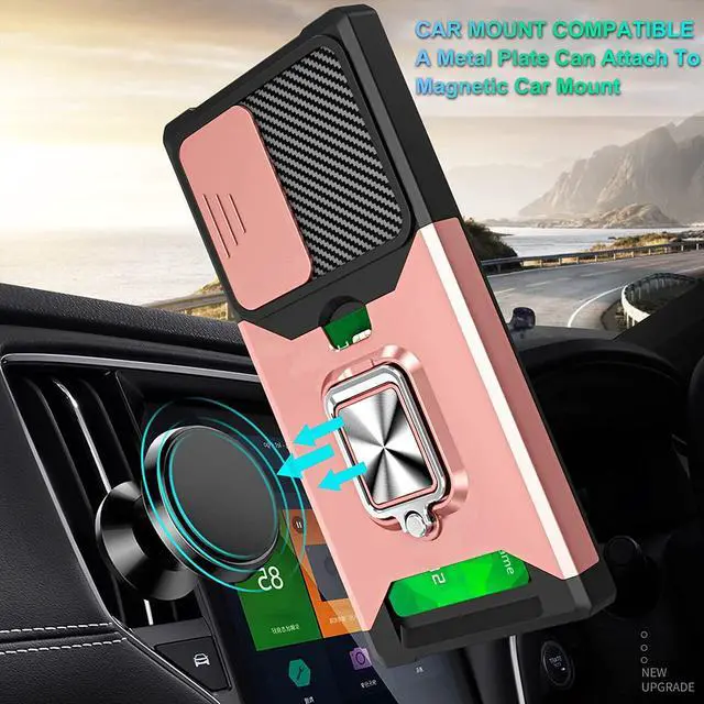 Features: Compatible with Samsung Galaxy S22 5G. Military Standard Shock Test MIL-STD 810G- 516.6 Protection. The case endured 26 drops (at 48in) on all 6 faces, 12 edges and 8 corners of the device and sustained zero damage to the appearance and internal hardware of the phone itself. Stylish, minimalist protection for your smartphone. Crafted from anti-scratch TPU and a super strong polycarbonate frame, the case protects your device while complimenting its sleek aesthetics. Reinforced corners are designed to deflect shock force away from your phone and the corners are the most vulnerable areas of any phone or case. The back of the case has a built-in extremely practical handle, Ring, which can be put on the finger to hold the phone more securely in your hand. Flip the ring out and it doubles as a kickstand to take your binge-watching experience to the next level. With this case, you can leave your wallet at home thanks to the credit card slot featured on the case. Privacy camera cover slides left or right for total protection. Impact-absorbing TPU perimeter guards the device against bumps and drops.