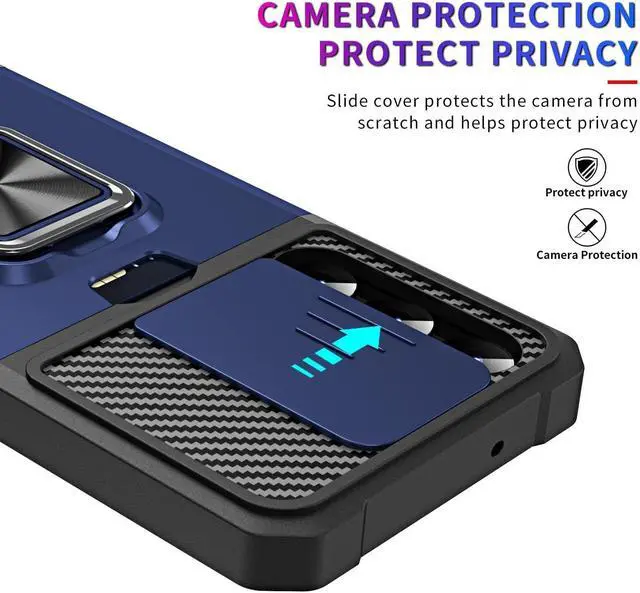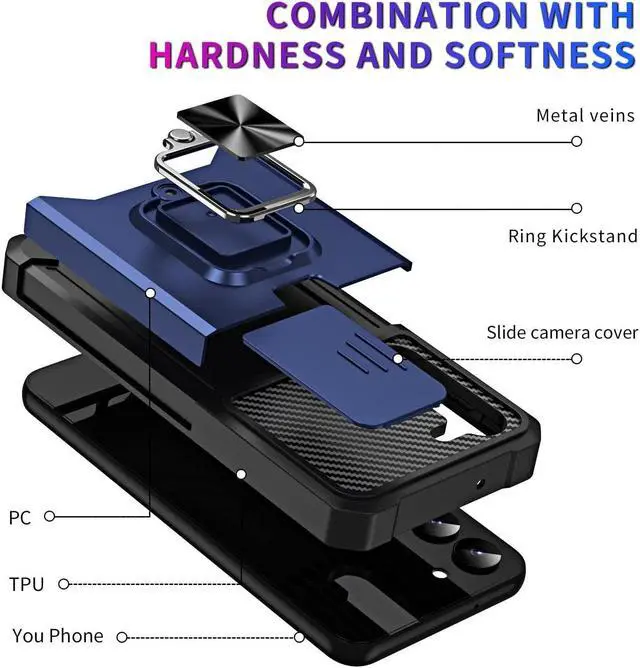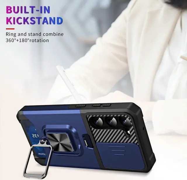 Features: Compatible with Samsung Galaxy S22 5G. Military Standard Shock Test MIL-STD 810G- 516.6 Protection. The case endured 26 drops (at 48in) on all 6 faces, 12 edges and 8 corners of the device and sustained zero damage to the appearance and internal hardware of the phone itself. Stylish, minimalist protection for your smartphone. Crafted from anti-scratch TPU and a super strong polycarbonate frame, the case protects your device while complimenting its sleek aesthetics. Reinforced corners are designed to deflect shock force away from your phone and the corners are the most vulnerable areas of any phone or case. The back of the case has a built-in extremely practical handle, Ring, which can be put on the finger to hold the phone more securely in your hand. Flip the ring out and it doubles as a kickstand to take your binge-watching experience to the next level. With this case, you can leave your wallet at home thanks to the credit card slot featured on the case. Privacy camera cover slides left or right for total protection. Impact-absorbing TPU perimeter guards the device against bumps and drops.