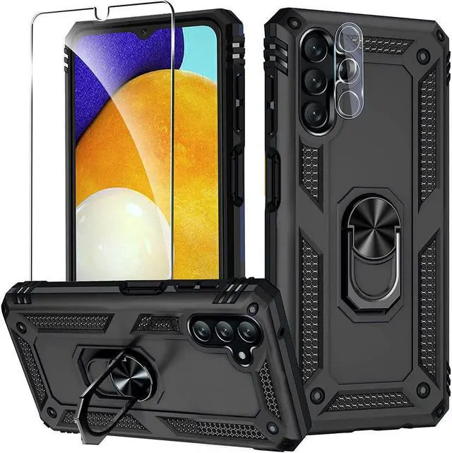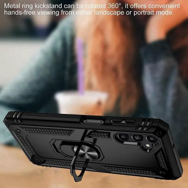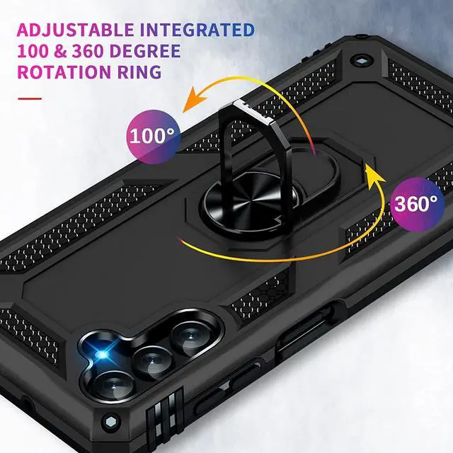 Features: Compatible with Samsung Galaxy A14 5G. Military Standard Shock Test MIL-STD 810G- 516.6 Protection. The case endured 26 drops (at 48in) on all 6 faces, 12 edges and 8 corners of the device and sustained zero damage to the appearance and internal hardware of the phone itself. Made from a special strong and lightweight durable material, providing you with long lasting protection for your smartphone without making it cumbersome. Ring holder for extra drop protection - in more ways than one. The built-it ring features a 180 & 360 degree rotating design to ensure a comfortable grip at any angle. Flip the ring out and it doubles as a kickstand to take your binge-watching experience to the next level. Unique mix material hybrid design.