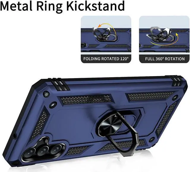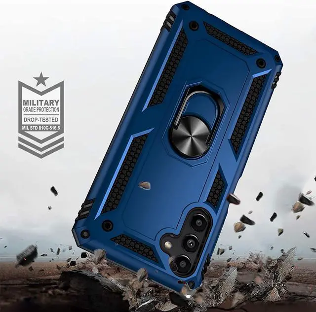 Features: Compatible with Samsung Galaxy A14 5G. Military Standard Shock Test MIL-STD 810G- 516.6 Protection. The case endured 26 drops (at 48in) on all 6 faces, 12 edges and 8 corners of the device and sustained zero damage to the appearance and internal hardware of the phone itself. Made from a special strong and lightweight durable material, providing you with long lasting protection for your smartphone without making it cumbersome. Ring holder for extra drop protection - in more ways than one. The built-it ring features a 180 & 360 degree rotating design to ensure a comfortable grip at any angle. Flip the ring out and it doubles as a kickstand to take your binge-watching experience to the next level. Unique mix material hybrid design.