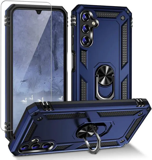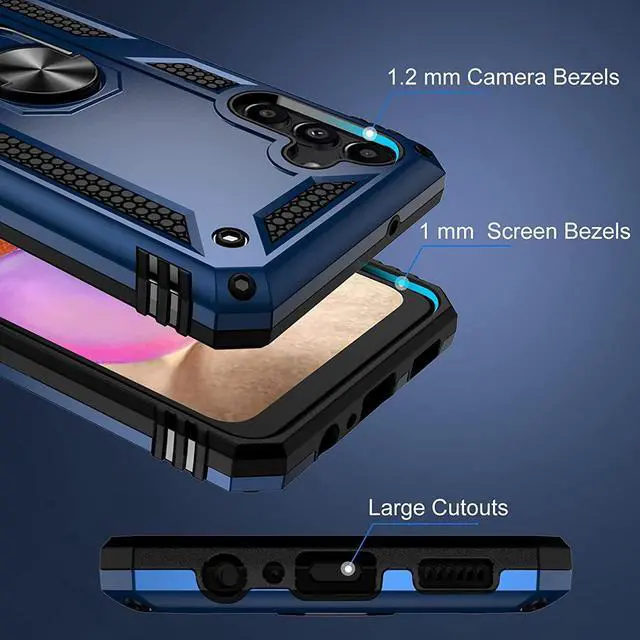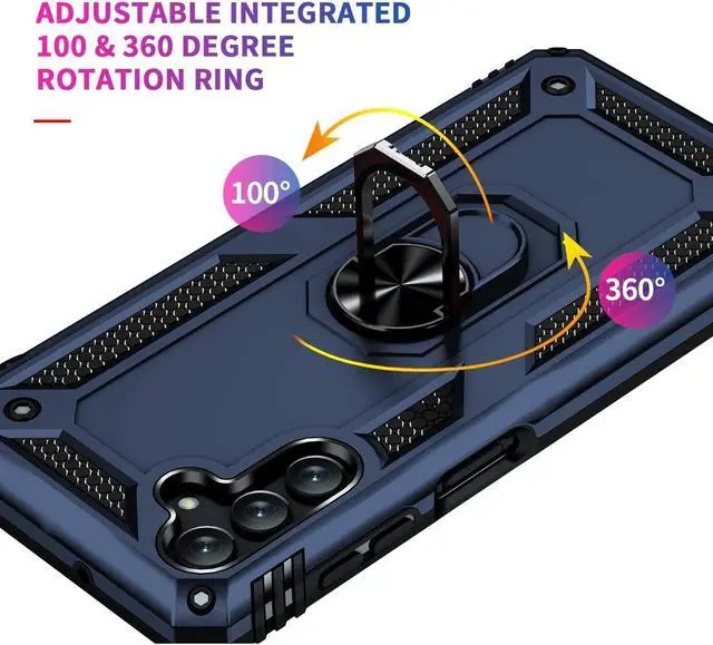 Features: Compatible with Samsung Galaxy A14 5G. Military Standard Shock Test MIL-STD 810G- 516.6 Protection. The case endured 26 drops (at 48in) on all 6 faces, 12 edges and 8 corners of the device and sustained zero damage to the appearance and internal hardware of the phone itself. Made from a special strong and lightweight durable material, providing you with long lasting protection for your smartphone without making it cumbersome. Ring holder for extra drop protection - in more ways than one. The built-it ring features a 180 & 360 degree rotating design to ensure a comfortable grip at any angle. Flip the ring out and it doubles as a kickstand to take your binge-watching experience to the next level. Unique mix material hybrid design.