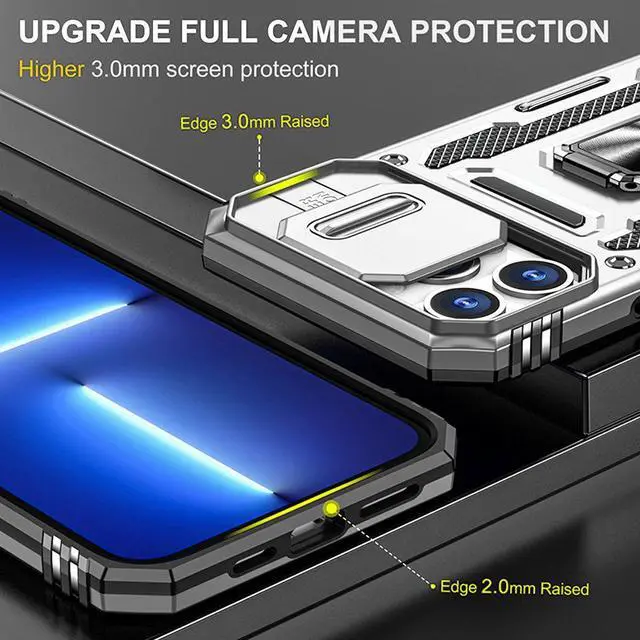 Features: Compatible with Apple iPhone 14 Pro. Military Standard Shock Test MIL-STD 810G- 516.6 Protection. The case endured 26 drops (at 48in) on all 6 faces, 12 edges and 8 corners of the device and sustained zero damage to the appearance and internal hardware of the phone itself. Made from a special strong and lightweight durable material, providing you with long lasting protection for your smartphone without making it cumbersome. The case features a handy finger loop that keeps your phone securely in hand while on your next adventure and even works as a viewing stand to watch movies. The ring grip folds flat and out of view if you do not want or need it. But if you do, simply pull the loop out, slip your finger through and you have an extra secure grip on your phone. Unique mix material hybrid design. This hard-wearing tough case safe-guards your phone against whatever life can throw your way, keeping your device secure at all times even in the most extreme of conditions. Raised front bezel and camera opening prevent scratches to the screen and camera lens.