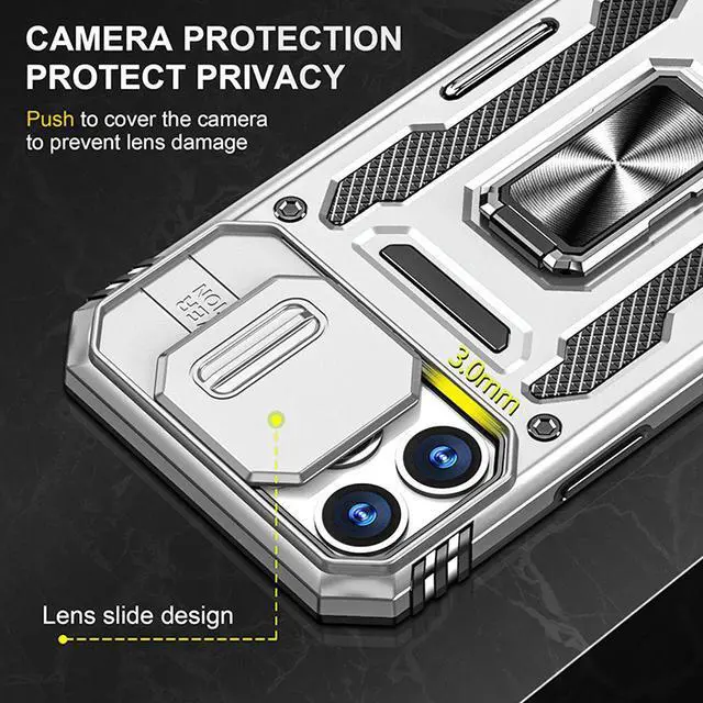 Privacy camera cover slides left or right for total protection. With fluid press buttons included in the design of this case, you can be sure to have a case that will protect your new device perfectly, without interrupting it's every day use. Enjoy magnetic mount compatibility, as the ring holder also functions as a built-in metal plate. Precise cutouts provide full access to your phone’ s important features, ports and button.