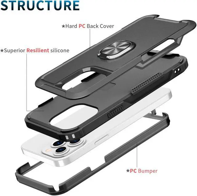 to withstands 4X MIL-STD (810G- 516.6 ), meaning the cases have been dropped at 2 meters with zero damage done to the device. Built into the case's corners are specially design air pockets that absorb impact and dissipate force away from your phone. Premium dual-material construction with polycarbonate backing and TPU perimeter creates a sleek profile without sacrificing protection. Impact-absorbing TPU perimeter guards the device against bumps and drops. The back of the case has a built-in extremely practical handle, Ring, which can be put on the finger to hold the phone more securely in your hand. Pull the ring out and have a handy viewing stand to comfortably watch your favorite show. Locking faceplate piece. Front bumpers raised slightly above your screen act to protect your screen when placed face down or dropped. Raised camera cut-out protects the lens from scratches when placing your phone on flat surface. Enjoy magnetic mount compatibility, as the ring holder also functions as a built-in metal plate. Precisely cutouts to preserve full use of volume buttons, charger, camera, microphone, and all other ports.
