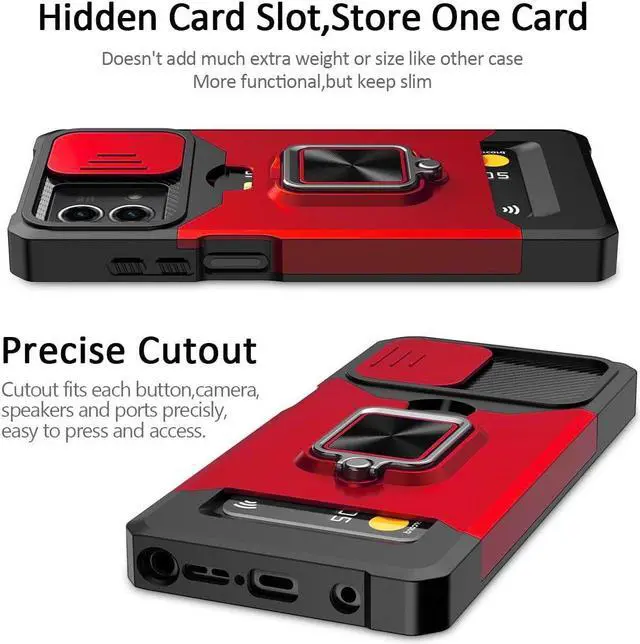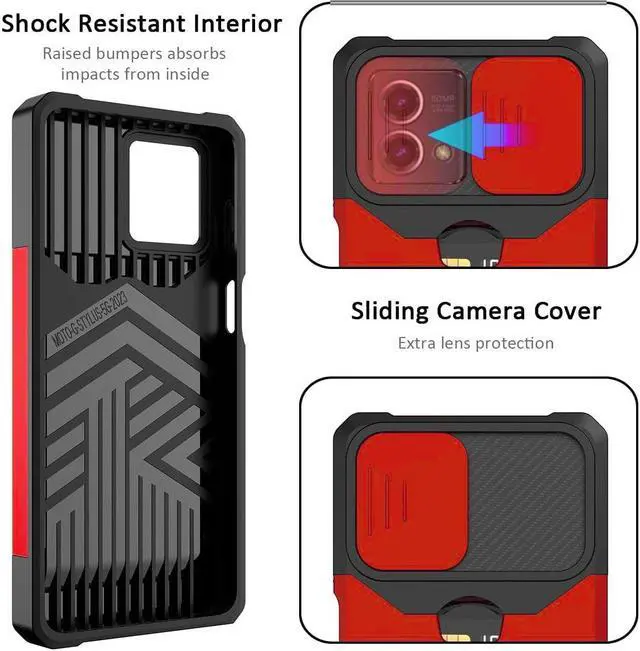 Features: Compatible with Motorola Moto G 5G 2023. Military Standard Shock Test MIL-STD 810G- 516.6 Protection. The case endured 26 drops (at 48in) on all 6 faces, 12 edges and 8 corners of the device and sustained zero damage to the appearance and internal hardware of the phone itself. Stylish, minimalist protection for your smartphone. Crafted from anti-scratch TPU and a super strong polycarbonate frame, the case protects your device while complimenting its sleek aesthetics. Reinforced corners are designed to deflect shock force away from your phone and the corners are the most vulnerable areas of any phone or case. The back of the case has a built-in extremely practical handle, Ring, which can be put on the finger to hold the phone more securely in your hand. Flip the ring out and it doubles as a kickstand to take your binge-watching experience to the next level. With this case, you can leave your wallet at home thanks to the credit card slot featured on the case. Privacy camera cover slides left or right for total protection. Impact-absorbing TPU perimeter guards the device against bumps and drops.