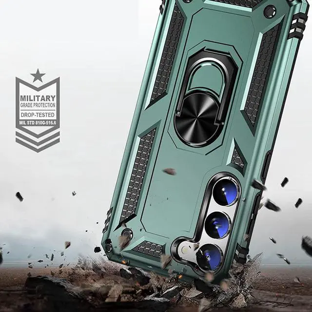 Features: Compatible with Samsung Galaxy S23 5G. Military Standard Shock Test MIL-STD 810G- 516.6 Protection. The case endured 26 drops (at 48in) on all 6 faces, 12 edges and 8 corners of the device and sustained zero damage to the appearance and internal hardware of the phone itself. Made from a special strong and lightweight durable material, providing you with long lasting protection for your smartphone without making it cumbersome. Ring holder for extra drop protection - in more ways than one. The built-it ring features a 180 & 360 degree rotating design to ensure a comfortable grip at any angle. Flip the ring out and it doubles as a kickstand to take your binge-watching experience to the next level. Unique mix material hybrid design.