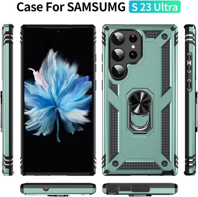 Features: Compatible with Samsung Galaxy S23 Ultra 5G. Military Standard Shock Test MIL-STD 810G- 516.6 Protection. The case endured 26 drops (at 48in) on all 6 faces, 12 edges and 8 corners of the device and sustained zero damage to the appearance and internal hardware of the phone itself. Made from a special strong and lightweight durable material, providing you with long lasting protection for your smartphone without making it cumbersome. Ring holder for extra drop protection - in more ways than one. The built-it ring features a 180 & 360 degree rotating design to ensure a comfortable grip at any angle. Flip the ring out and it doubles as a kickstand to take your binge-watching experience to the next level. Unique mix material hybrid design.
