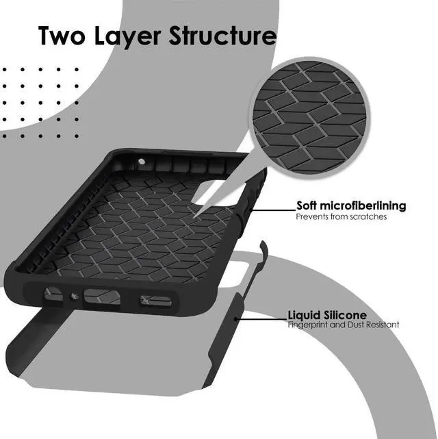 Layer 2: One-piece custom molded polycarbonate shell. 9 ft. drop protection to ensure safety from accident falls. The air cushion corners and bumper edges reduces impact force. Raised-edge bezel protects the screen and camera. Soft-touch finish. Scratch & discoloration resistant. Tactile buttons. Enjoy magnetic mount compatibility, as the ring holder also functions as a built-in metal plate. Precise cutouts provide full access to your phone’ s important features, ports and button.