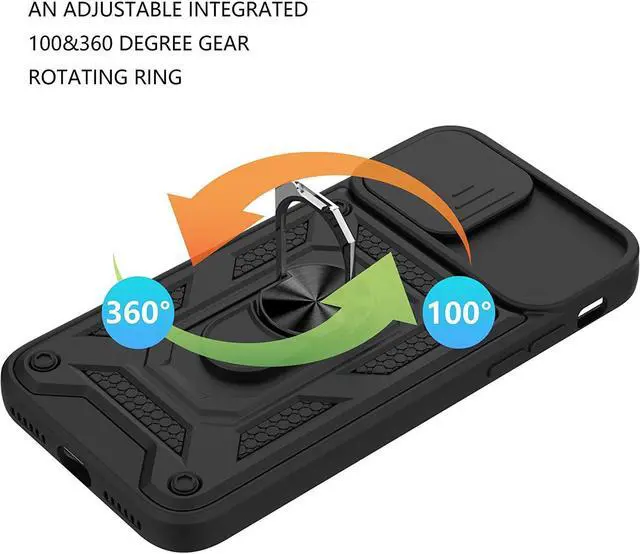 Features: Extensively drop tested, so you can feel reassured that your device is well protected. Stylish, minimalist protection for your smartphone. Premium dual-material construction with polycarbonate backing and TPU perimeter creates a sleek profile without sacrificing protection. Finger loop for extra drop protection - in more ways than one. The built-it ring features a 180 & 360 degree rotating design to ensure a comfortable grip at any angle. Flip the Ring out and it doubles as a kickstand to take your binge-watching experience to the next level. Polycarbonate panel slides to lock over camera area protecting lenses as well as promoting camera security. Impact-absorbing TPU perimeter guards the device against bumps and drops. This case is effortlessly easy to install and looks great on your phone. Front bumpers raised slightly above your screen act to protect your screen when placed face down or dropped. Raised camera cut-out protects the lens from scratches when placing your phone on flat surface. Built-in magnetic plate for using on magnetic car mount (car mount not included). Precisely cutouts to preserve full use of volume buttons, charger, camera, microphone, and all other ports.