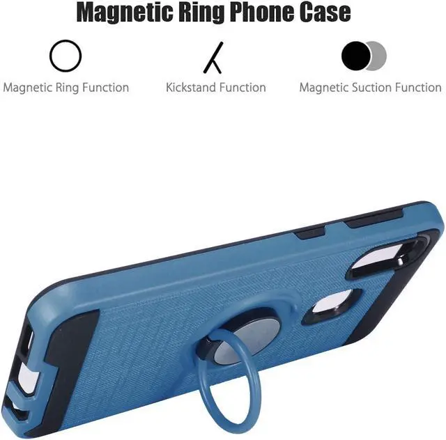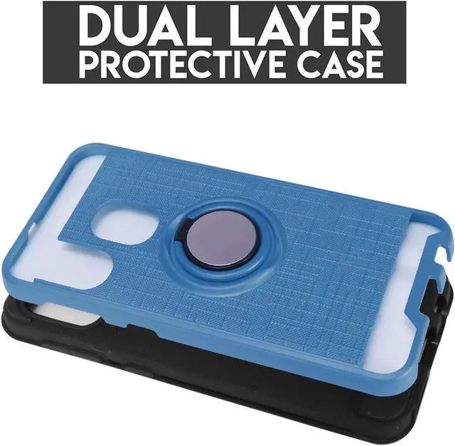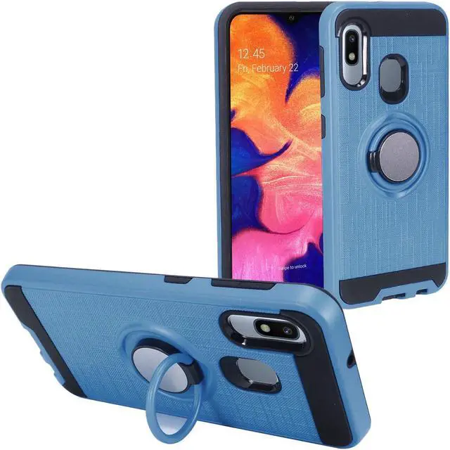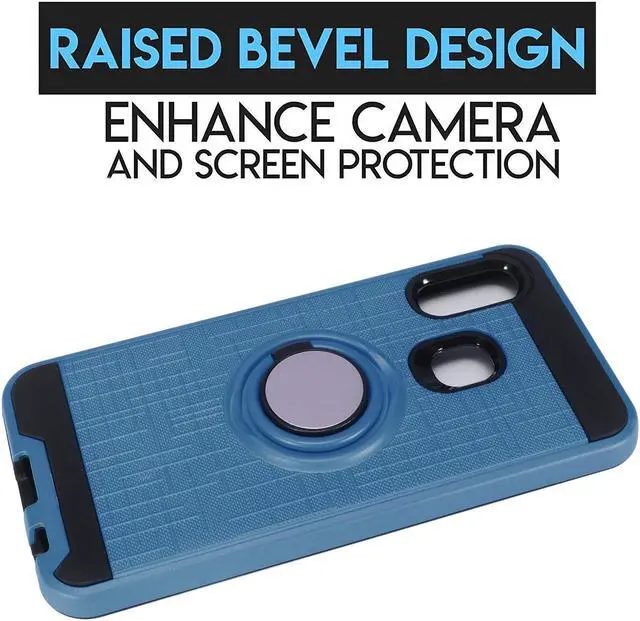Layer 2: One-piece custom molded polycarbonate shell. Integrated ring stand gives more support in the hand for wider reach on touchscreen. Ring holder also work as a kickstand and folds seamlessly into the back cover for comfortable convenience in or out of the hand. Built-in magnetic plate for using on magnetic car mount (car mount not included). Precise cutouts provide full access to your phone’ s important features, ports and button. Compatible with Samsung Galaxy A10e.
