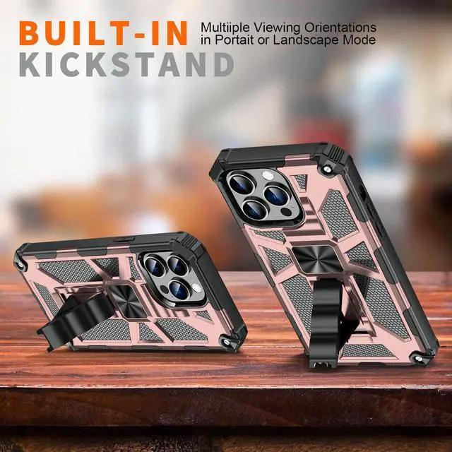 Features: Compatible with Apple iPhone 14 Pro Max. Military Standard Shock Test MIL-STD 810G- 516.6 Protection. The case endured 26 drops (at 48in) on all 6 faces, 12 edges and 8 corners of the device and sustained zero damage to the appearance and internal hardware of the phone itself. Featuring a robust military design with premium rugged protection. Composite layers of shock-absorbing thermopolyurethane and ultra-resistant reinforced polycarbonate take all the punishment your daily travel and use can throw at your phone, including drop protection. Reinforced air cushion corners are designed to deflect shock force away from your phone and the corners are the most vulnerable areas of any phone or case. Located at the back of the case is a super-convenient flip-out kickstand. Folding completely flat when not in use, the kickstand can be called upon at will, allowing you to effortlessly watch media at any time and in any place. The sleek military styling and ruggedized construction of the case combines to create a case that perfectly compliments the phone's stunning design. Raised bezels on the case protects your screen and camera from scratches. Intuitive button covers for a tactile experience.