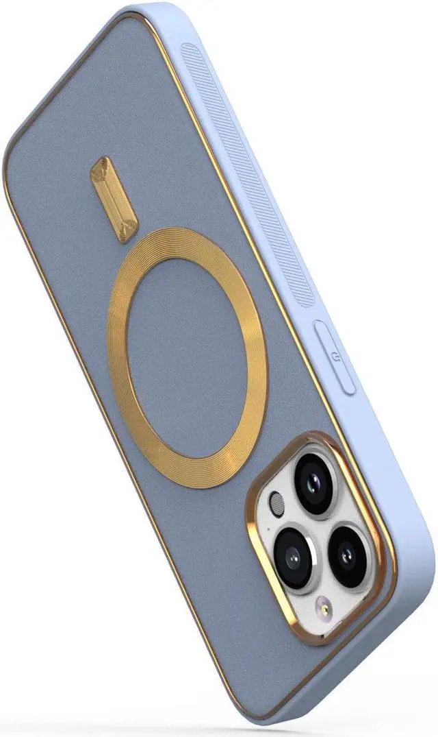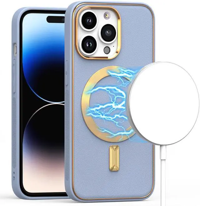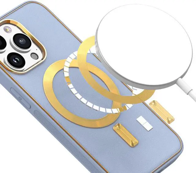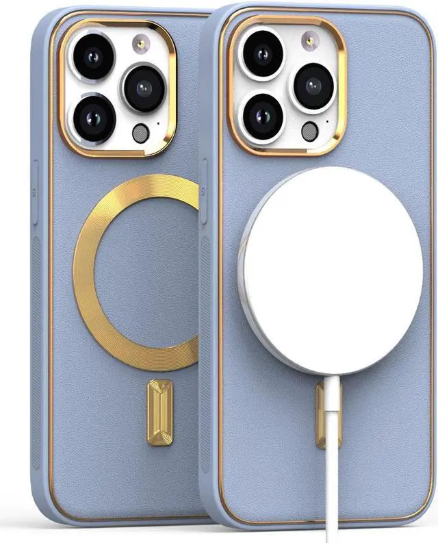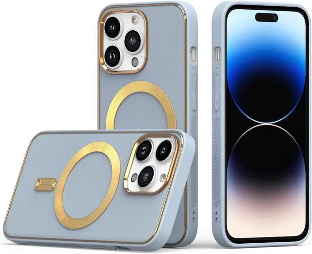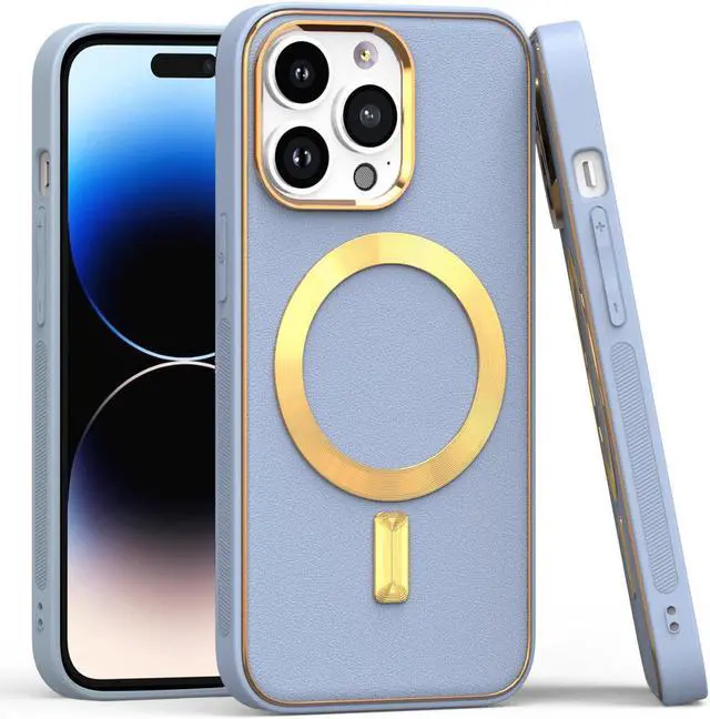 Features: Compatible with Apple iPhone 14 Pro. Designed to interact with Apple’ s MagSafe ecosystem. Compatible with Apple MagSafe chargers and accessories so you can power up without removing the case. Thanks to the case's design, your phone won't have added bulk all the way around, helping to keep your phone as slim and light as it was designed to be. The stylish leather finish not only feels great in hand, but it also provides excellent grip - reducing the risk of accidental drops and bumps. Premium TPU bumper material for durable flexibility. Front bumpers raised slightly above your screen act to protect your screen when placed face down or dropped. Custom gold color camera and MagSafe ring trim. Raised camera cut-out with integrated camera lens bumper protector protects the lens from scratches when placing your phone on flat surface. Embossed buttons for an easy, conspicuous press. Precisely cutouts to preserve full use of volume buttons, charger, camera, microphone, and all other ports.