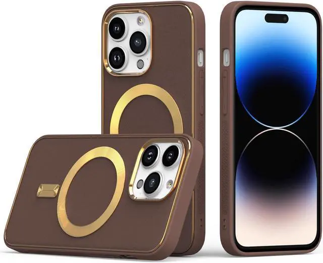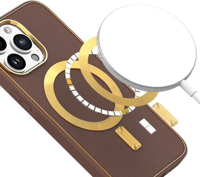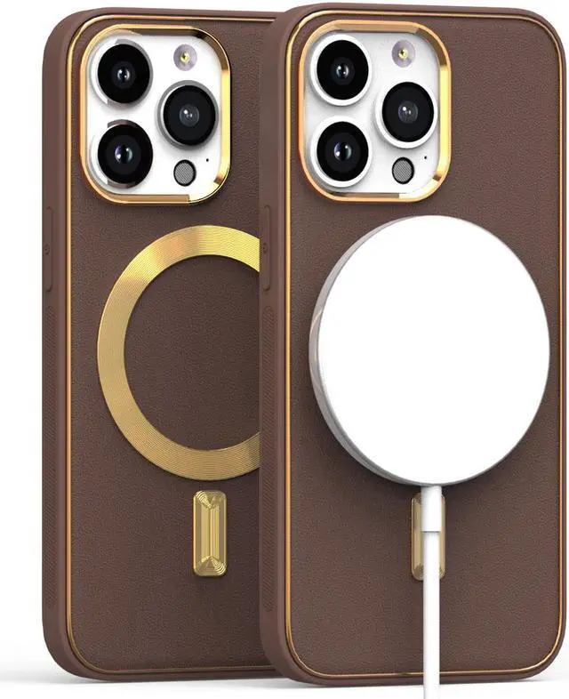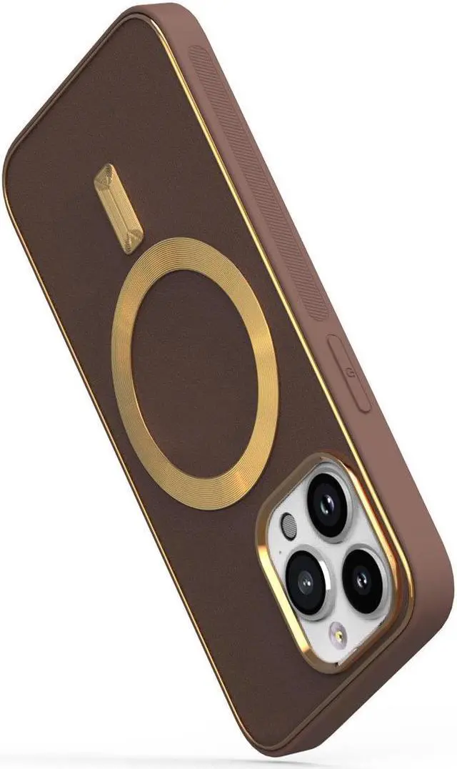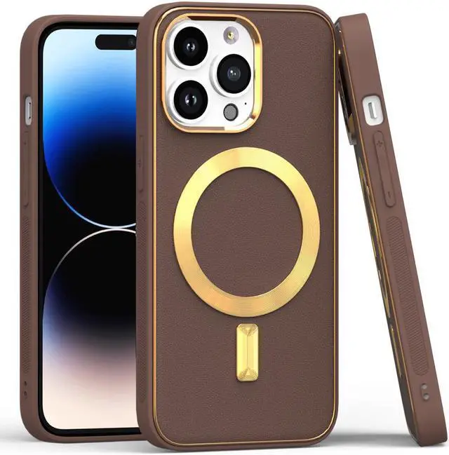Features: Compatible with Apple iPhone 14 Pro. Designed to interact with Apple’ s MagSafe ecosystem. Compatible with Apple MagSafe chargers and accessories so you can power up without removing the case. Thanks to the case's design, your phone won't have added bulk all the way around, helping to keep your phone as slim and light as it was designed to be. The stylish leather finish not only feels great in hand, but it also provides excellent grip - reducing the risk of accidental drops and bumps. Premium TPU bumper material for durable flexibility. Front bumpers raised slightly above your screen act to protect your screen when placed face down or dropped. Custom gold color camera and MagSafe ring trim. Raised camera cut-out with integrated camera lens bumper protector protects the lens from scratches when placing your phone on flat surface. Embossed buttons for an easy, conspicuous press. Precisely cutouts to preserve full use of volume buttons, charger, camera, microphone, and all other ports.