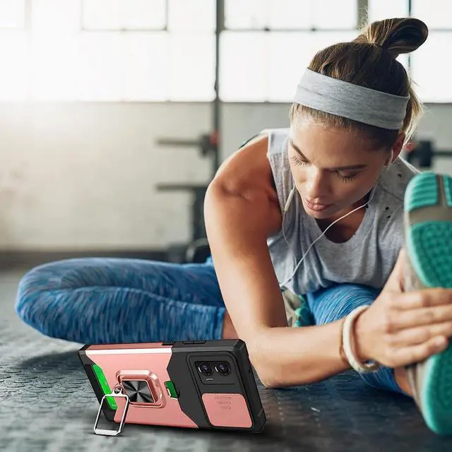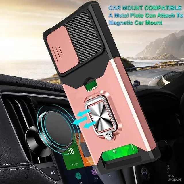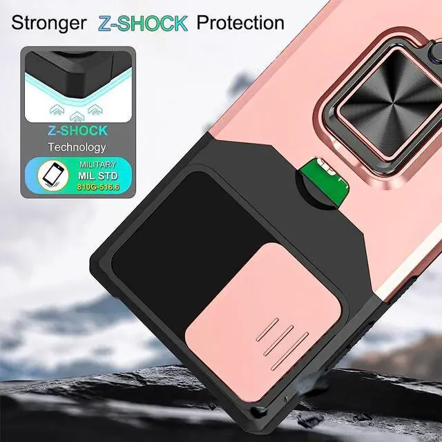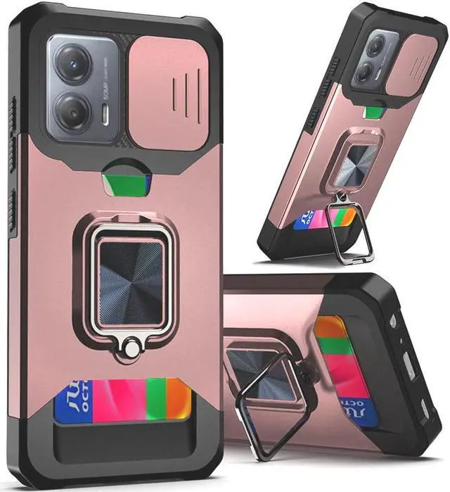 Features: Compatible with Motorola Moto G 5G 2023. Military Standard Shock Test MIL-STD 810G- 516.6 Protection. The case endured 26 drops (at 48in) on all 6 faces, 12 edges and 8 corners of the device and sustained zero damage to the appearance and internal hardware of the phone itself. Stylish, minimalist protection for your smartphone. Crafted from anti-scratch TPU and a super strong polycarbonate frame, the case protects your device while complimenting its sleek aesthetics. Reinforced corners are designed to deflect shock force away from your phone and the corners are the most vulnerable areas of any phone or case. The back of the case has a built-in extremely practical handle, Ring, which can be put on the finger to hold the phone more securely in your hand. Flip the ring out and it doubles as a kickstand to take your binge-watching experience to the next level. With this case, you can leave your wallet at home thanks to the credit card slot featured on the case. Privacy camera cover slides left or right for total protection. Impact-absorbing TPU perimeter guards the device against bumps and drops.