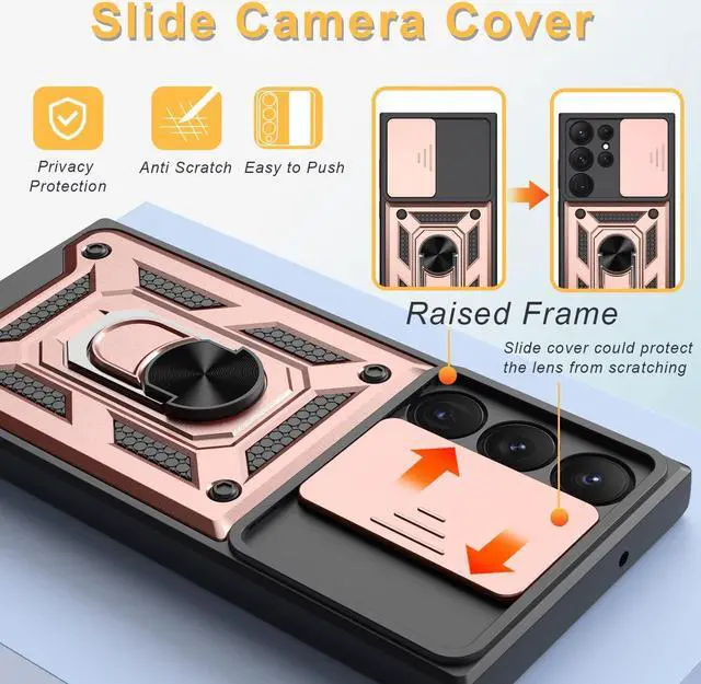 Features: Compatible with Samsung Galaxy S23 Ultra 5G. Extensively drop tested, so you can feel reassured that your device is well protected. Stylish, minimalist protection for your smartphone. Premium dual-material construction with polycarbonate backing and TPU perimeter creates a sleek profile without sacrificing protection. Ring holder for extra drop protection - in more ways than one. The built-it ring features a 180 & 360 degree rotating design to ensure a comfortable grip at any angle. Flip the ring out and it doubles as a kickstand to take your binge-watching experience to the next level. Polycarbonate panel slides to lock over camera area protecting lenses as well as promoting camera security. Impact-absorbing TPU perimeter guards the device against bumps and drops. This case is effortlessly easy to install and looks great on your phone. Front bumpers raised slightly above your screen act to protect your screen when placed face down or dropped. Raised camera cut-out protects the lens from scratches when placing your phone on flat surface. Enjoy magnetic mount compatibility, as the ring holder also functions as a built-in metal plate. Precisely cutouts to preserve full use of volume buttons, charger, camera, microphone, and all other ports.