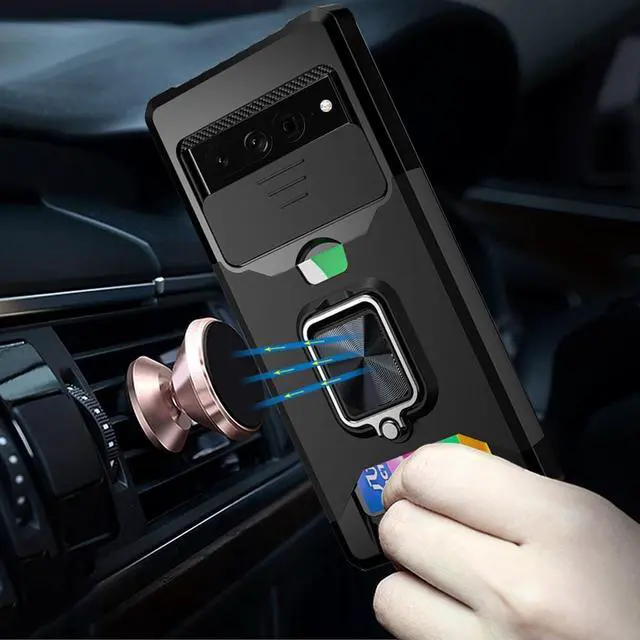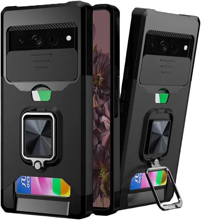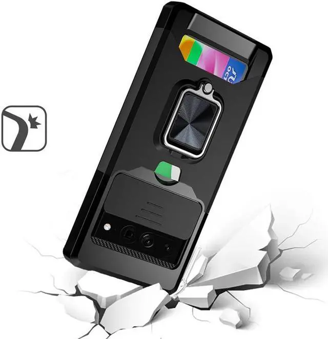Features: Compatible with Google Pixel 7 Pro. Military Standard Shock Test MIL-STD 810G- 516.6 Protection. The case endured 26 drops (at 48in) on all 6 faces, 12 edges and 8 corners of the device and sustained zero damage to the appearance and internal hardware of the phone itself. Stylish, minimalist protection for your smartphone. Crafted from anti-scratch TPU and a super strong polycarbonate frame, the case protects your device while complimenting its sleek aesthetics. Reinforced corners are designed to deflect shock force away from your phone and the corners are the most vulnerable areas of any phone or case. The back of the case has a built-in extremely practical handle, Ring, which can be put on the finger to hold the phone more securely in your hand. Flip the ring out and it doubles as a kickstand to take your binge-watching experience to the next level. With this case, you can leave your wallet at home thanks to the credit card slot featured on the case. Privacy camera cover for total protection. Impact-absorbing TPU perimeter guards the device against bumps and drops. This case is effortlessly easy to install and looks great on your phone.