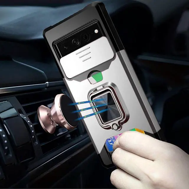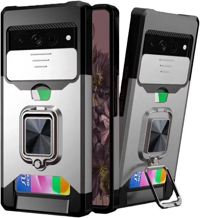 Features: Compatible with Google Pixel 7 Pro. Military Standard Shock Test MIL-STD 810G- 516.6 Protection. The case endured 26 drops (at 48in) on all 6 faces, 12 edges and 8 corners of the device and sustained zero damage to the appearance and internal hardware of the phone itself. Stylish, minimalist protection for your smartphone. Crafted from anti-scratch TPU and a super strong polycarbonate frame, the case protects your device while complimenting its sleek aesthetics. Reinforced corners are designed to deflect shock force away from your phone and the corners are the most vulnerable areas of any phone or case. The back of the case has a built-in extremely practical handle, Ring, which can be put on the finger to hold the phone more securely in your hand. Flip the ring out and it doubles as a kickstand to take your binge-watching experience to the next level. With this case, you can leave your wallet at home thanks to the credit card slot featured on the case. Privacy camera cover for total protection. Impact-absorbing TPU perimeter guards the device against bumps and drops. This case is effortlessly easy to install and looks great on your phone.