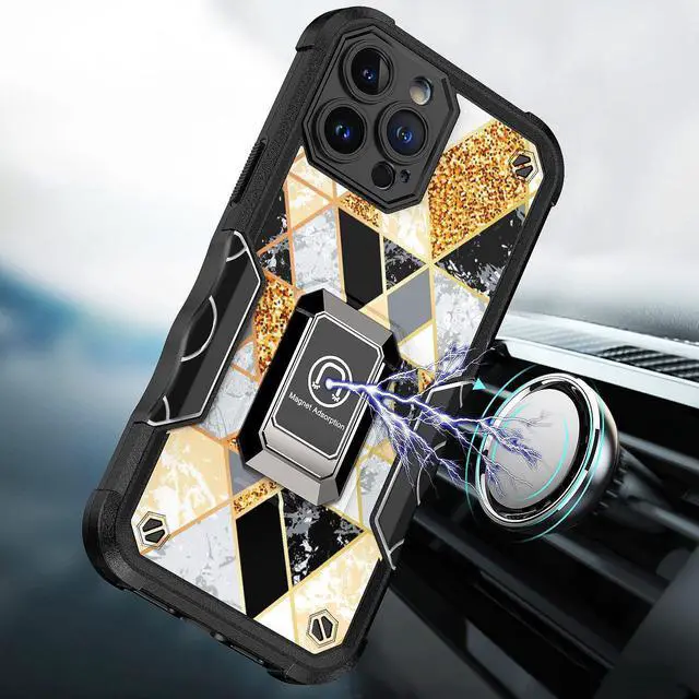 Military Grade Shockproof Hybrid Armor Case with Ring Grip for iPhone 14 Pro - Marble Gold