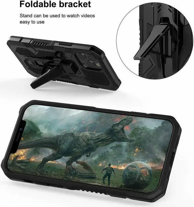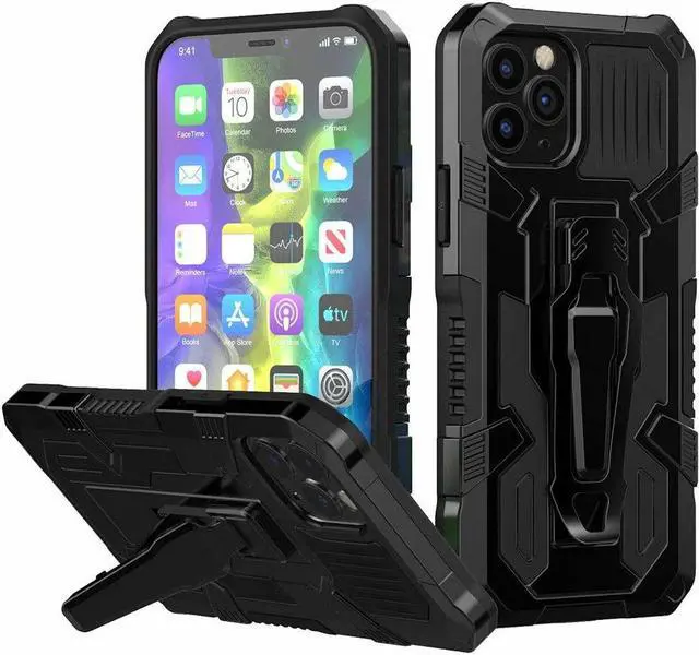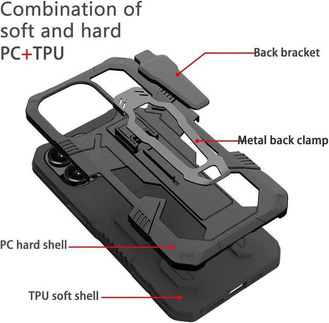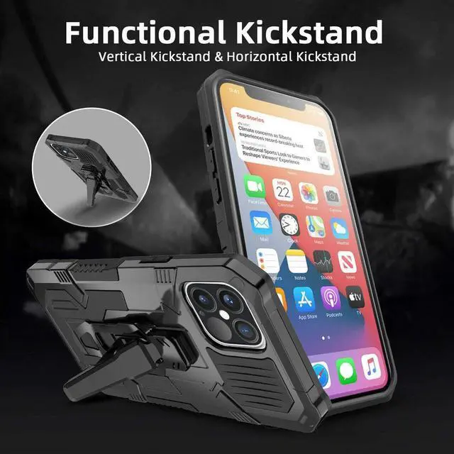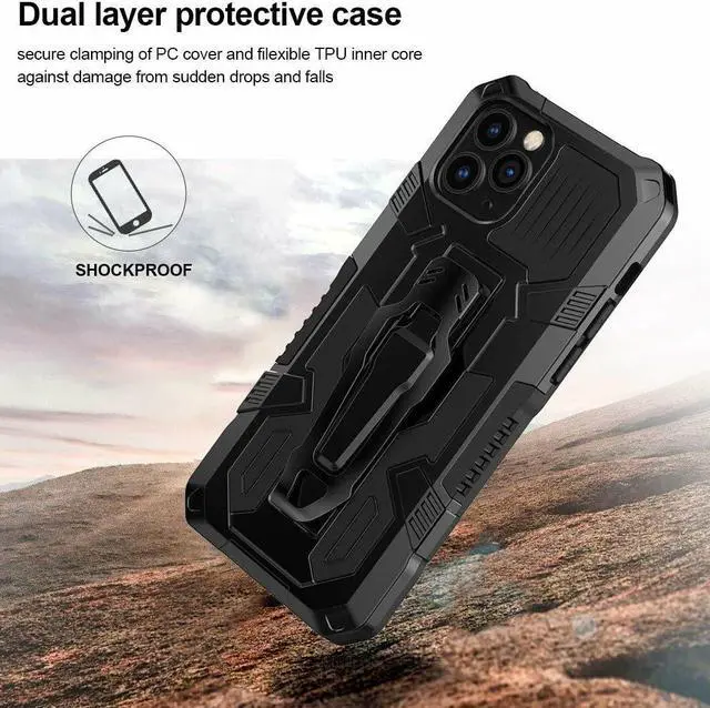 Features: Compatible with Apple iPhone 14 Pro Max. Military Standard Shock Test MIL-STD 810G- 516.6 Protection. The case endured 26 drops (at 48in) on all 6 faces, 12 edges and 8 corners of the device and sustained zero damage to the appearance and internal hardware of the phone itself. Integrated metal belt clip which can liberate your hands. With it, you can clip the phone on the belt / the edge of the trouser pocket / or other places. Located at the back of the case is a super-convenient flip-out kickstand. Folding completely flat when not in use, the kickstand can be called upon at will, allowing you to effortlessly watch media at any time and in landscape mode. Featuring a robust multi-layered design, the case provides extreme protection for your smartphone. Extra cushioning points to all four corners to secure your device against all drops and bumps. Made from a special strong and lightweight durable material, providing you with long lasting protection for your smartphone without making it cumbersome. Raised front bezel and camera opening prevent scratches to the screen and camera lens.