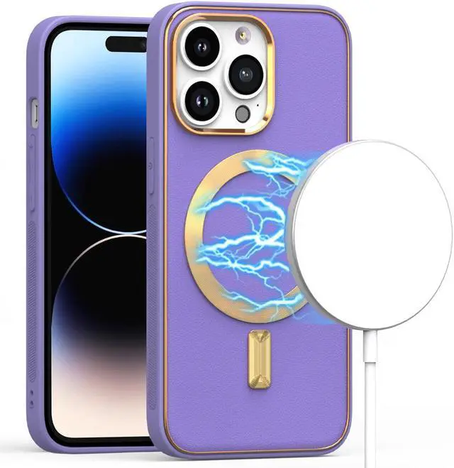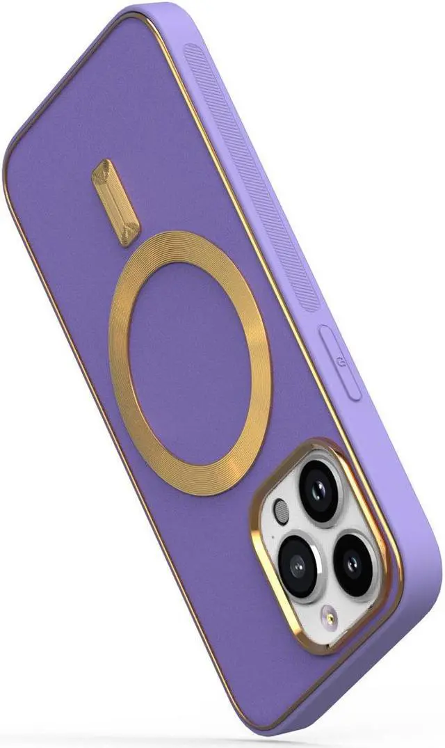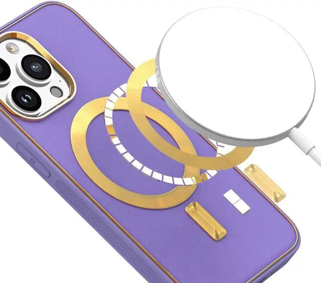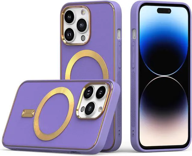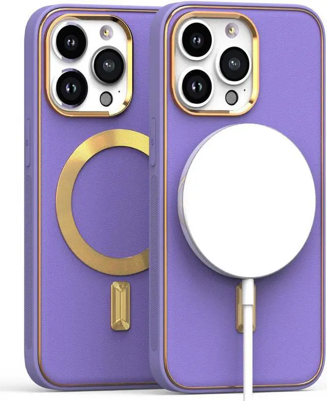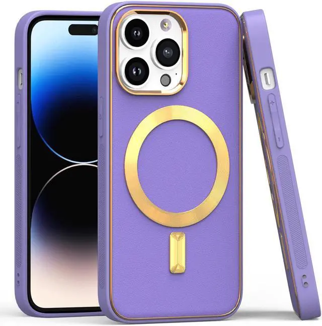 Features: Compatible with Apple iPhone 14 Pro. Designed to interact with Apple’ s MagSafe ecosystem. Compatible with Apple MagSafe chargers and accessories so you can power up without removing the case. Thanks to the case's design, your phone won't have added bulk all the way around, helping to keep your phone as slim and light as it was designed to be. The stylish leather finish not only feels great in hand, but it also provides excellent grip - reducing the risk of accidental drops and bumps. Premium TPU bumper material for durable flexibility. Front bumpers raised slightly above your screen act to protect your screen when placed face down or dropped. Custom gold color camera and MagSafe ring trim. Raised camera cut-out with integrated camera lens bumper protector protects the lens from scratches when placing your phone on flat surface. Embossed buttons for an easy, conspicuous press. Precisely cutouts to preserve full use of volume buttons, charger, camera, microphone, and all other ports.