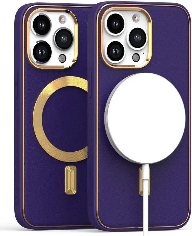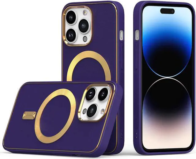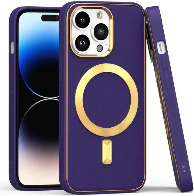 Features: Compatible with Apple iPhone 14. Designed to interact with Apple’ s MagSafe ecosystem. Compatible with Apple MagSafe chargers and accessories so you can power up without removing the case. Thanks to the case's design, your phone won't have added bulk all the way around, helping to keep your phone as slim and light as it was designed to be. The stylish leather finish not only feels great in hand, but it also provides excellent grip - reducing the risk of accidental drops and bumps. Premium TPU bumper material for durable flexibility. Front bumpers raised slightly above your screen act to protect your screen when placed face down or dropped. Custom gold color camera and MagSafe ring trim. Raised camera cut-out with integrated camera lens bumper protector protects the lens from scratches when placing your phone on flat surface. Embossed buttons for an easy, conspicuous press. Precisely cutouts to preserve full use of volume buttons, charger, camera, microphone, and all other ports.