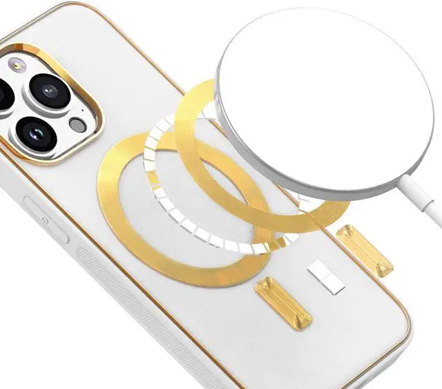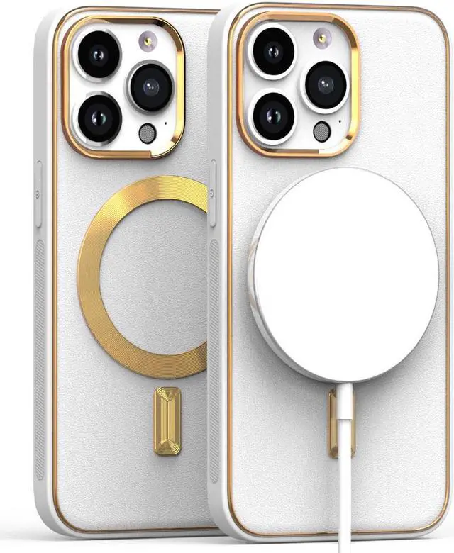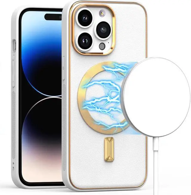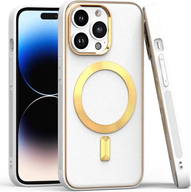 Features: Compatible with Apple iPhone 14 Pro. Designed to interact with Apple’ s MagSafe ecosystem. Compatible with Apple MagSafe chargers and accessories so you can power up without removing the case. Thanks to the case's design, your phone won't have added bulk all the way around, helping to keep your phone as slim and light as it was designed to be. The stylish leather finish not only feels great in hand, but it also provides excellent grip - reducing the risk of accidental drops and bumps. Premium TPU bumper material for durable flexibility. Front bumpers raised slightly above your screen act to protect your screen when placed face down or dropped. Custom gold color camera and MagSafe ring trim. Raised camera cut-out with integrated camera lens bumper protector protects the lens from scratches when placing your phone on flat surface. Embossed buttons for an easy, conspicuous press. Precisely cutouts to preserve full use of volume buttons, charger, camera, microphone, and all other ports.