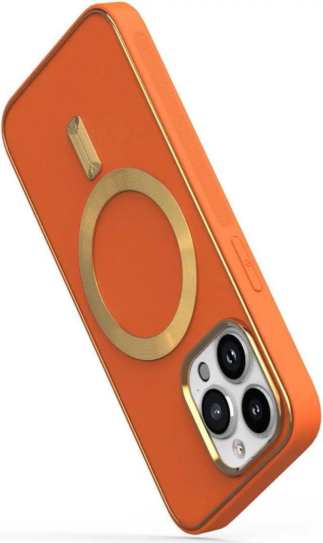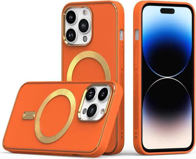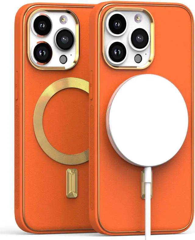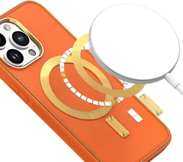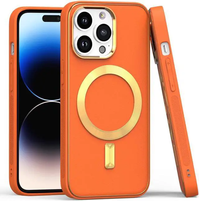Features: Compatible with Apple iPhone 14. Designed to interact with Apple’ s MagSafe ecosystem. Compatible with Apple MagSafe chargers and accessories so you can power up without removing the case. Thanks to the case's design, your phone won't have added bulk all the way around, helping to keep your phone as slim and light as it was designed to be. The stylish leather finish not only feels great in hand, but it also provides excellent grip - reducing the risk of accidental drops and bumps. Premium TPU bumper material for durable flexibility. Front bumpers raised slightly above your screen act to protect your screen when placed face down or dropped. Custom gold color camera and MagSafe ring trim. Raised camera cut-out with integrated camera lens bumper protector protects the lens from scratches when placing your phone on flat surface. Embossed buttons for an easy, conspicuous press. Precisely cutouts to preserve full use of volume buttons, charger, camera, microphone, and all other ports.