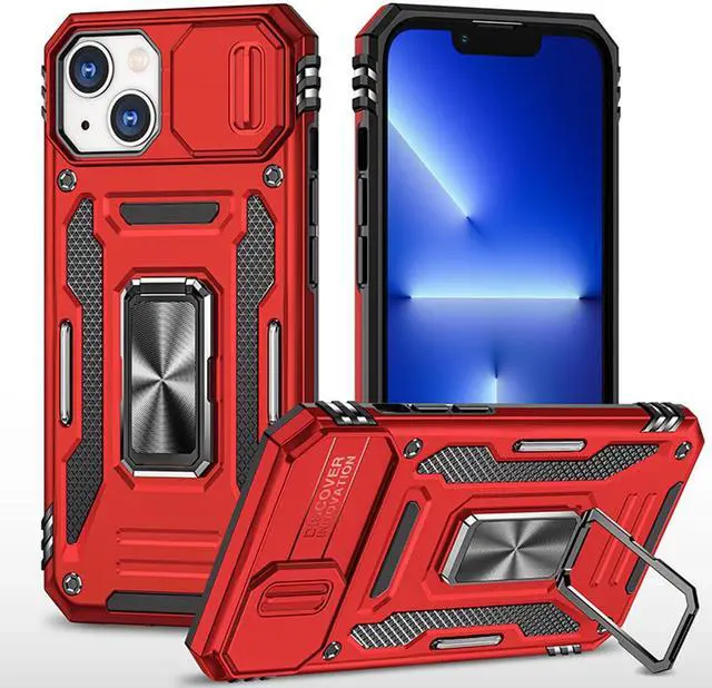 Features: Compatible with Apple iPhone 14. Military Standard Shock Test MIL-STD 810G- 516.6 Protection. The case endured 26 drops (at 48in) on all 6 faces, 12 edges and 8 corners of the device and sustained zero damage to the appearance and internal hardware of the phone itself. Made from a special strong and lightweight durable material, providing you with long lasting protection for your smartphone without making it cumbersome. The case features a handy finger loop that keeps your phone securely in hand while on your next adventure and even works as a viewing stand to watch movies. The ring grip folds flat and out of view if you do not want or need it. But if you do, simply pull the loop out, slip your finger through and you have an extra secure grip on your phone. Unique mix material hybrid design. This hard-wearing tough case safe-guards your phone against whatever life can throw your way, keeping your device secure at all times even in the most extreme of conditions. Raised front bezel and camera opening prevent scratches to the screen and camera lens. Privacy camera cover slides left or right for total protection.
