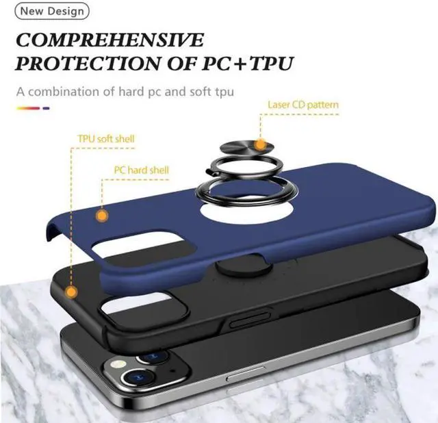 Features: Compatible with Apple iPhone 14 Plus. Made from reinforced bonded thermopolyurethane and high quality polycarbonate materials, which makes it flexible enough to absorb punishment but hard enough to resist potential damage. 360° rotating ring grip. Horizontal kickstand. Ultra-slim, lightweight and minimal design. Equipped with two-piece design, you can easily pop the case on and off with ease while still feeling ultimately protected. Get maximum safety and easy access to all buttons and ports from raised bezel edges, shock-absorbing corners, and a non-slip bumper grip. Enjoy magnetic mount compatibility, as the ring holder also functions as a built-in metal plate.