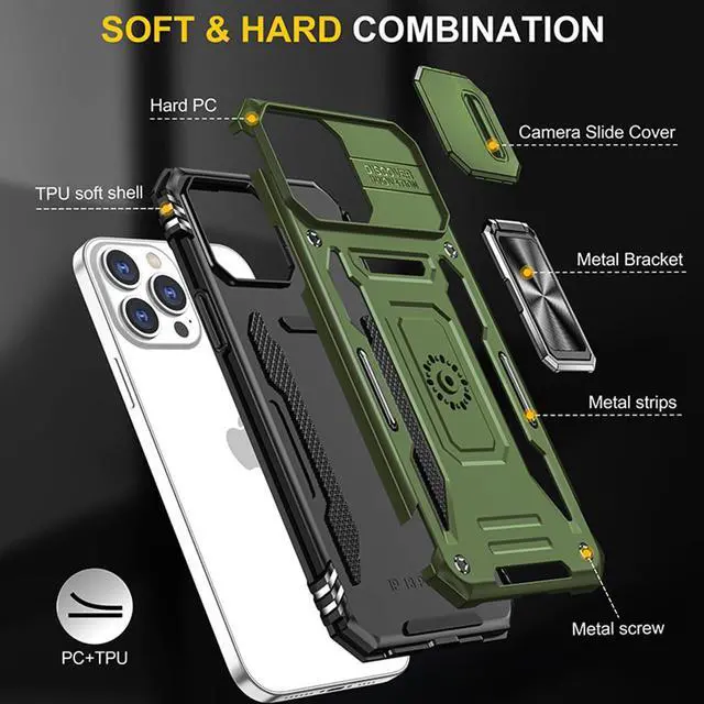 Features: Compatible with Apple iPhone 14 Pro Max. Military Standard Shock Test MIL-STD 810G- 516.6 Protection. The case endured 26 drops (at 48in) on all 6 faces, 12 edges and 8 corners of the device and sustained zero damage to the appearance and internal hardware of the phone itself. Made from a special strong and lightweight durable material, providing you with long lasting protection for your smartphone without making it cumbersome. The case features a handy finger loop that keeps your phone securely in hand while on your next adventure and even works as a viewing stand to watch movies. The ring grip folds flat and out of view if you do not want or need it. But if you do, simply pull the loop out, slip your finger through and you have an extra secure grip on your phone. Unique mix material hybrid design. This hard-wearing tough case safe-guards your phone against whatever life can throw your way, keeping your device secure at all times even in the most extreme of conditions. Raised front bezel and camera opening prevent scratches to the screen and camera lens.